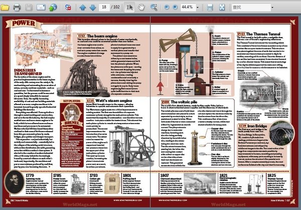 这是一本国外很有名的杂志,它以图文并茂的方式向你解释科学,技术,交通,空间,历史和第环境的奥秘,让你了解你周围的世界。 Welcome to How It Works, the magazine that explains everything you never knew you wanted to know about the world we live in. Loaded with fully illustrated guides and expert knowledge, and with sections dedicated to science, technology, transportation, space, history and the environment, no subject is too big or small for How It Works to explain.