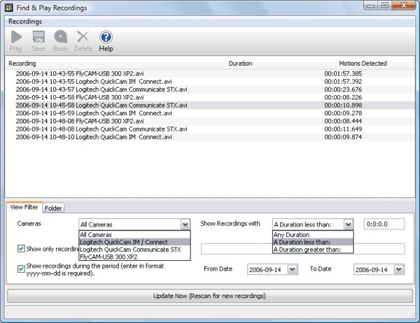 Find and play surveillance recordings ordered by camera, date, duration and motion detected