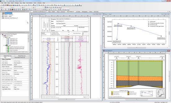 Strater 3 adds the ability to create maps to display well locations, base maps, and well selector lines. Strater 3 also adds cross sections that interpolate between wells.