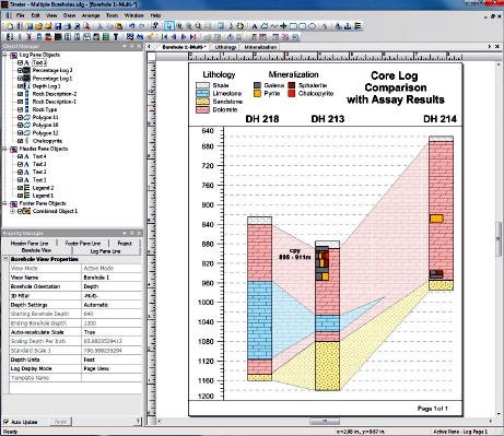 a powerful well logging and borehole plotting software package. Strater creates 14 different log types: depth, line/symbol, crossplot, zone bar, bar, percentage, tadpole, post, classed post, complex text, graphic, lithology, well construction, and function logs. Each of the logs can be modified to suit your needs.