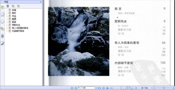 《风光的精要--光线的捕捉与雕刻》的三个部分均探讨如何用光的问题。这无疑是风光摄影中最难办和最具挑战性的。第一部分“荒野风光”由乔·科尼什负责;第二部分“有人为因素的景观”由查理·韦特撰稿:第三部分“内部细节景观”由戴维·沃德完成。每一部分的后面都附有“摄影讲习班的内容:几位摄影师对书中收集的作品发表各自的建设性评判并提出有益的建议。