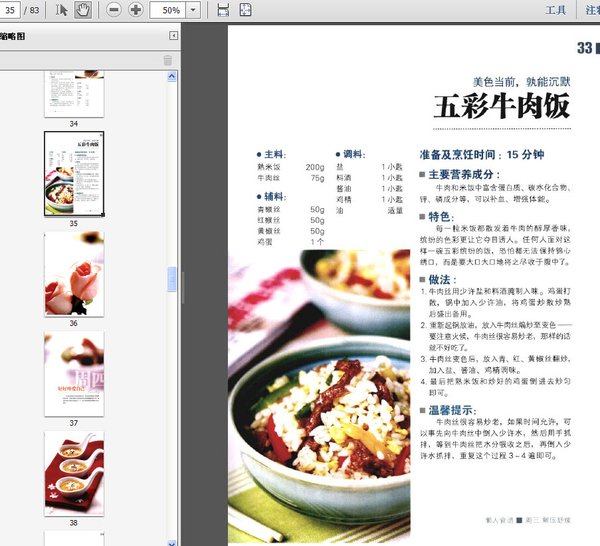 : 周一 最阳光的开始 罗曼蒂克的快乐诠释——无糖法式吐司&煎香蕉 水果也能当主角——香橙排骨 黑白素配一品鲜——双笋木耳 激情四溢的口味——香辣炒蟹 内外兼修的新主张——牛排蔬菜卷 周二 田园清新 美汤如画——百合枣梨汤 喷香的甜美质感——黄金玉米饼 绿野仙踪——凉拌西兰花 能不忆江南——青菜蟹黄肉丸 第一道想学的菜——西红柿炒鸡蛋 周三 解压舒缓 有滋有味——果脯八宝粥 收藏起老北京的味道——京酱肉丝 飘飘欲仙——清蒸生蚝 让舌尖被温婉的麻辣俘虏——新式辣子鸡 美色当前,孰能沉默——五彩牛肉饭 周四 好好疼爱自己 又一次浪漫约会——奶酪南瓜汤 珠圆玉润——珍珠丸子 纤长的别样魅力——酱香芦笋 浓浓味,悉心补——黄豆猪蹄汤 周五 期待“黎明” 加油好味——牛肉乌冬面 湘味独到——酸豆角炒鸡胗 红玉勾人之迷情周末——油爆大虾 滑美至鲜——鱼香海鲜蛋羹 让你不得不“就饭”——梅菜扣肉 周六 异国风情 百转千回的好味——意大利面 串起来的新式美味——水果串串烧 每一口都饱满——奶香烤玉米 意大利“馅饼”最本色的吃法——乳酪海鲜比萨 周日 养精蓄锐 一碗总是不够——皮蛋瘦肉粥 醉人之意不在酒——橙汁醪糟汤圆 温柔如丝般缠绕——蒜蓉粉丝蒸扇贝 有了它,晚餐才完美——冬瓜排骨玉米汤 两边都是最爱——双色剁椒鱼头 美食江湖宝典 攻无不克 美食健康之章 战无不胜 玩转烹饪之章