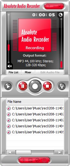 Absolute Audio Recorder provides a snappy and user-friendly interface for users. Our user interface is presented extremely simple with all buttons and controls big and clear enough even for those poor-sighted. Even elementary users can perform all actions just by one mouse click.