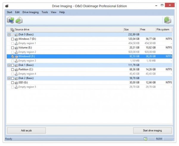 When backing up your PC, O&O DiskImage saves both personal files as well as drive information and individual settings. This not only protects irreplaceable files, such as family photos, vacation videos and office documents, but you also save yourself in the event of a crash the lengthy set up and reinstall of all the programs and the Windows operating system. You can image entire computer, system and data drives or only individual files and/or folders.