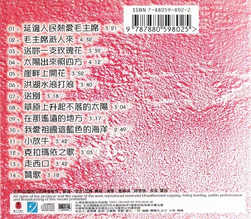 : 01.延边人民热爱毛主席 02.毛主席派人来 03送你一支玫瑰花 04.太阳出来照四方 05.岸畔上开花 06.洪湖水浪打浪 07.送别 08.草原上升起不落的太阳 09.在那遥远的地方 10.我爱祖国这蓝色的海洋 11.小放牛 12.克拉玛依之歌 13.走西口 14.赞歌