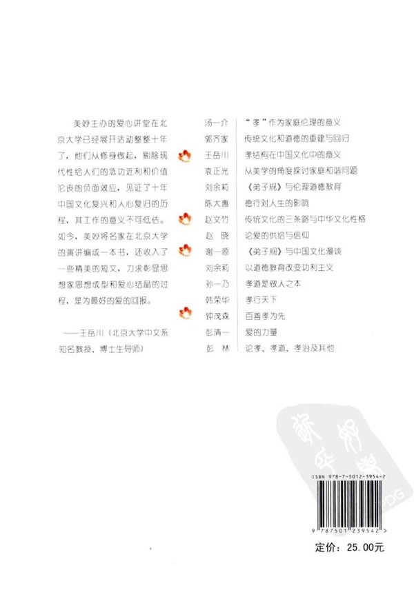 美妙主办的爱心讲堂在北京大学已经展开活动整整十年了,他们从修身做起,剔除现代性给人们的急功近利和价值沦丧的负面效应,见证了十年中国文化复兴和人心复归的历程,其工作的意义不可低估。如今,美妙将名家在北京大学的演讲编成一本书,还收入了一些精美的短文,力求彰显思想家思想成型和爱心结晶的过程,是为最好的爱的回报。
