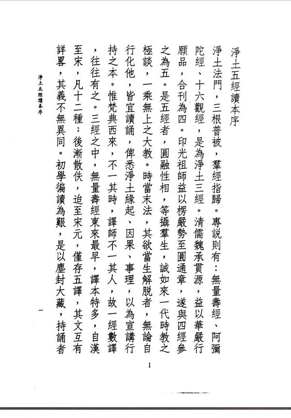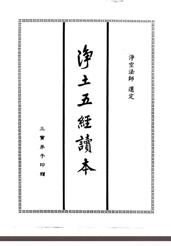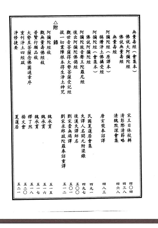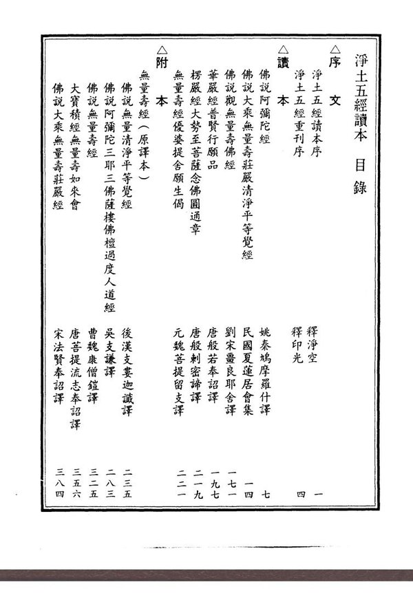 : 目录 序文 净土五经读本序 净土五经重刊序 读本 佛说阿弥陀经 佛说大乘无量寿清净庄严平等觉经 佛说观无量寿经 华严经普贤菩萨行愿品 楞严经大势至菩萨圆通章 无量寿经优婆提舍愿生偈 附本 无量寿经(原译本) 佛说无量寿清净平等觉经 佛说阿弥陀三耶三佛萨楼佛檀过度人道经 佛说无量寿经 大宝积经无量寿如来会 佛说大乘无量无量寿庄严经 无量寿经(会集本) 佛说大阿弥陀经 佛说无量寿经 无量寿经 阿弥陀经(原译本) 称赞净土佛摄受经 阿弥陀经(会集本) 佛说阿弥陀经 阿弥陀鼓音声王陀罗尼经 观世音菩萨得大势菩萨受记经 拔一切业障根本得生净土神咒 附录 阿弥陀经叙 观无量寿佛经叙 普贤行愿品叙 大势至菩萨念佛圆通章序 重刊净土四经跋 净修捷要