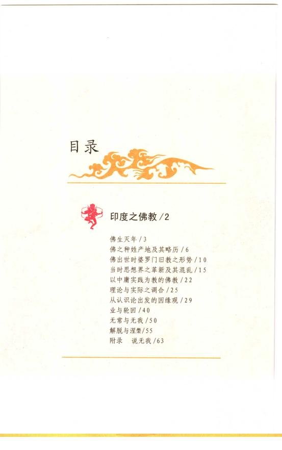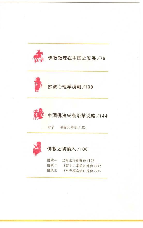 : 印度之佛教 佛生灭年 佛之种姓产地及其略历 佛出世时婆罗门旧教之形势 当时思想界之革新及其混乱 以中庸实践为教的佛教 理论与实际之调合 从认识论出发的因缘观 业与轮回 无常与无我 解脱与涅槃 附录 说无我 佛教教理在中国之发展 佛教心理学浅测 中国佛法兴衰沿革说略 附录 佛教大事表 佛教之初输入 附录一 汉明示法说辨伪 附录二 《四十二章经》辨伪 附录三 《牟子理惑论》辨伪