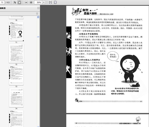 : 第一章 血型与牲格的纠结——了解镜中人/001 第一节 我和性格作斗争,千万别牺牲/002 一、A型血人的8个烽火性格/002 二、B型血人的7个烽火性格/004 三、AB型血人的7个烽火性格/006 四、O型血人的7个烽火性格/009 第二节 理想很丰满。生活很骨感/011 一、A型血人生活中最突出的10个特征/011 二、B型血人生活中最突出的9个特征/012 三、AB型血人生活中最突出的10个特征/014 四、O型血最突出的10个特征/015 第三节 向钱看,向厚赚/017 一、A型血人的消费观——“铁公鸡”/017 二、B型血人的消费观——“月头多多、月底空空”/018 三、AB型血人的消费观一善于“哭穷”/019 四、O型血人的消费观——以小搏大/019 第四节 男为知己者绅士,女为悦己者美容/021 一、A型血人的麻辣男女/021 (一)A型血男子一大男子主义、责任心强/021 (二)破译A型血男子八项密码/022 (三)A型血女子一贤妻良母,好挑毛病/023 (四)破译A型血女子八项密码/024 二、B型血人的麻辣男女/025 (一)B型血男子——为人坦率不摆架子,缺乏毅力和耐/025 (二)破译A型血男子八项密码/025 (三)B型血女子一性情爽快亲切,情绪多变/027 (四)破译A型血女子八项密码/028 三、AB型血人的麻辣男女/029 (一)AB型血男子一家庭责任男/029 (二)破译A型血男子八项密码/030 (三)AB型血女子一稳重可爱女/031 (四)破译A型血女子八项密码//031 四、O型血的麻辣男女/033 (一)O型血男子一意志坚定、敢于冒险/033 (二)破译A型血男子八项密码/∞3 (三)O型血女子——爱惜名誉、母性极强/034 (四)破泽A型衄女子八项密码/035 第二章 血型与爱情的缘分——寻找另一半/037 第一节 爱情,可以熟视拥有,却不能面对失去/038 一、痴情的A型血人/038 二、爱与友爱十分相似的B型血人/039 三、AB型血人的戏剧式爱情/040 四、O型血人的现实之恋/041 第二节 令人不能自拔的除了牙齿还有爱情,042 一、A型血人的痴情之恋/042 (一)A型血人的恋爱奇缘/043 (二)A型血人爱情他她恋/044 二、B型血人的寂寞之恋/046 (一)日型血人的恋爱奇缘/046 (二)B型血人爱情他她恋/04 三、AB型血人恋爱戏剧/048 (一)AB型血人的恋爱奇缘/048 (二)AB型血人爱情他她恋/049 四、O型血人的依附之恋/050 (一) O型血人的恋爱奇缘/050 (二) O型血人爱情他她恋/051 第三节 感情的戏,可以有演技/053 一、A型血人的痴男怨女/053 二、B型血人的痴男怨女/054 三、AB型血人的痴男怨女/055 四、O型血人的痴男怨女/057 第四节 如果爱,请深爱059 一、A型血人的爱情秘笈/059 二、8型血人的爱情秘笈/060 三、AB型血人的爱情秘笈/061 四、O型血人的爱情秘笈/063 第三章 血型与人际关系——出手好牌/005 第一节 总是跟我提别人。也跟别人提提/066 一、A型血人心理定律——多疑/066 二、B型血人心理定律——第一印象不太好/067 …… 第四章 血型与职场成败——将薪比薪 第五章 星座与血型的碰撞——神秘的对应关系