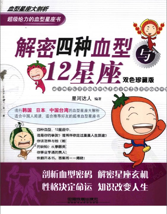 《解密四种血型与12星座(双色珍藏版)》:流行韩国日本、中国台.湾的血型星座大解析、适合中国人阅读、适合推荐好友的超准血型星座书 四种血型、12星座中,谁是你的挚友?谁将伴你走过漫漫人生旅途?你该怎样与他(她)交往?怎样弥补你性格上的缺陷?从事哪类工作让你更有发展?谁才是你事业亨通的贵人?……快翻开《解密四种血型与12星座(双色珍藏版)》,答案将一一揭晓!剖新血型密码,解密星座玄机、性格决定命运,知识改变人生。 书将为你解密四种血型、12星座以及与四种血型对应的各星座人的性格、爱情、婚姻、人际交往、工作事业等方面的特点,以及星河达人对你努力进取摆脱困境的建议和忠告。让你了解自己,了解身边的人,了解和你工作、生活在一起的人,不仅可以大大增加你的能力和魅力,还可以为你书写自己精彩的人生而“加油、给力”!