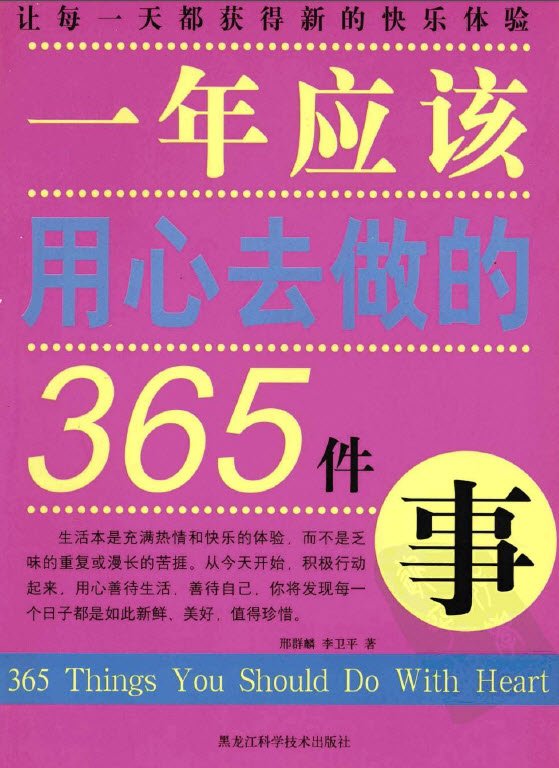 让每一天都获得新的快乐体验。   生活本是充满热情和快乐的体验,而不是乏味的重复或漫长的苦捱。从今天开始,积极行动起来,用心善待生活,善待自己,你将发现每一个日子都是如此新鲜、美好,值得珍惜。   一年365天,我们要如何去度过?是让每一天都成为崭新的一天,还是日复一日,今天重复着昨天,明天又重复着今天?我们怎样才能让这每一年、每一天都成为自己无悔人生中精彩的一部分?我们是不是应该去思考:一年365天,有哪些事值得我们用心去做,并且体会其中的快乐、充实与希望?