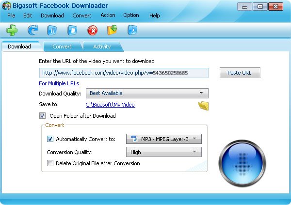 Bigasoft Facebook Downloader is both Facebook Video Downloader and Facebook Video Converter. The advanced Facebook Converter is also the professional Facebook MP3 Converter. It is so simple to download video from Facebook and convert Facebook video with just one tool.