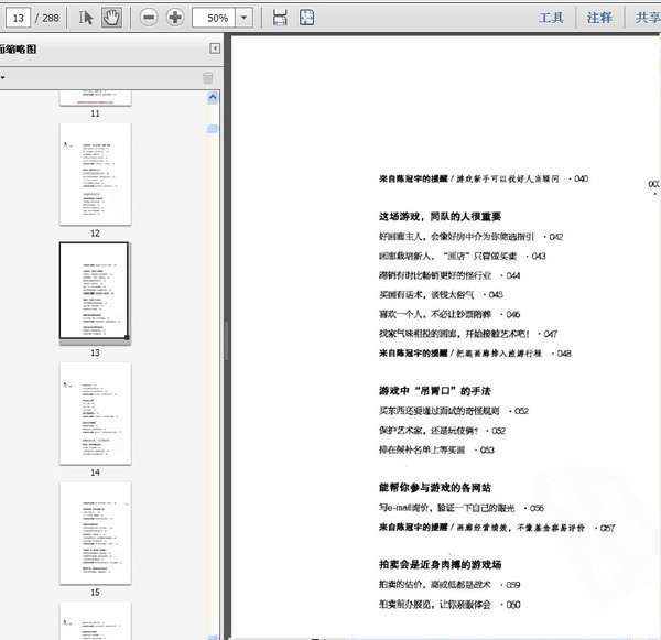 作者把多年赏画买画的经验和故事娓娓道来,既教给读者很多收藏鉴赏的知识,也传达了一种独特的收藏观和文化观。这本书不是讨论艺术,它是借助买(卖)艺术的人常玩的金钱游戏,来告诉我们怎样赚艺术的钱。我们最关心的两大内容都在其中:让你拥有赚钱的眼光和理性的思维,同时在赚钱中处好社交之道.