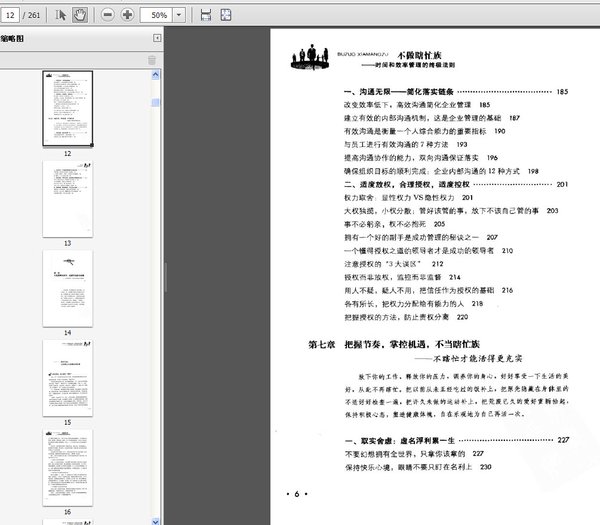 : 第一章 不光要埋头拉车,还要学会抬头看路——目标明确,方向无误就不会瞎忙 许多时候,光知道埋头苦干是不够的,因为如此一来,你就看不到前方到底是平坦大道,还是崎岖山路(甚至有可能是万丈深渊)。所以,我们不光要埋头拉车,还要学会抬头看路。不管是企业还是个人,对愿景的描绘代表了对未来发展方向的一种期望、一种预测、一种定位。只有清楚了未来的发展方向,才能有针对性地制订出切实可行的目标。目标明确,方向无误,这样才不会瞎忙。 一、没有目标。只会像无头苍蝇乱闯乱撞 没有目标,怎么能不“瞎忙” 不光要埋头拉车,更要抬头看路 方向是人生的指路牌,它比速度更重要 把目标当成挑战,莫让忙碌变“茫碌” 细数目标十大益处,坚定树立成功信心 学会用目标规划自己的人生 二、企业的大目标,个人的小目标。都有章可循 让目标成为自己唯一的选择 按部就班,制订目标的8大步骤 综合考虑影响目标的4大因素 中规中矩,遵守制订目标的5大原则 不贪多求大,确定最可能实现的目标 由大及小,描绘企业的宏伟愿景 企业要发展,就必须制订可行性目标 建立长效机制,企业战略目标体系的构建 三、目标要具体可行。脱离实际只能造就海市蜃楼 树形结构解读目标的具体化原则 目标再大再难,也要有个期限 不可三心二意,同一阶段只忙于有限的目标 经营人生,加强目标管理 第二章 有条不紊,不要东一榔头,西一棒子——合理计划才能不瞎忙 工作必须要有计划。无论是对于自己职业道路的整体规划,还是处理每一天的工作计划,都是你充分利用有限的时间和精力,为自己的事业大厦不断夯实基础所必不可少的工作唯有这样,才能使自己忙碌而不盲目,忙得更高效。 一、事前想得清,事中才不会瞎折腾 眉毛胡子一把抓,其实就是在瞎忙 缺乏可行性计划就等于没有目标 事前想得清,事中才不会瞎折腾 二、计划越合理。越有操作性 合理安排,把握制订计划的6大要素 注重实效,制订计划的要点与技巧 及时修正计划,调整步伐,纠正偏差 最优方案的不确定性,没有最好,只有更好 第三章 忙要忙到点子上,提高效率有方法——用正确的方法做事才可不瞎忙 只有在正确的方法指导下,才能以最少的时间、最少的资源解决问题,完成任务,得到结果。一个绝妙的方法有时候就是机会大门的敲门砖,也是你一生之中的转折点。 一、做事讲方法。方可事半功倍 瞎忙是大脑在偷懒,不讲方法白做功 接到任务,下手之前先找方法 不找借口找方法,办法总比问题多 想办法才会有办法,有方法才能解决问题 手脚勤不如头脑勤,思考比勤奋更重要 做事讲方法,就能事半功倍 善于总结,在工作中寻找方法和规律 二、分清轻重缓急,找到将事情变简单的诀窍 划分工作层次,分清轻重缓急 优先原则,先做最重要的事情 施行“二八法则”,抓住20%的关键重点 提高核心竞争力,把注意力集中在核心问题上 把事情变复杂很简单,把事情交简单却很复杂 安排工作讲技巧,委派工作的7个步骤 三、认准核心目标。不要搞错了对象 没意识,“瞎忙族”总是在做无用功 方法重要,战略也不可少 放慢脚步,跳出效率设置的陷阱 避开追求效率的10个误区 两个笔记本,一支烂笔头,解决大问题 做正确的事,把事情做正确 第四章 专注且有效,不要一条道跑到黑——集中精力做对事才不会瞎忙 曾经有一位哲学家讲过,人生专攻一点在某一方面做出成绩,就算是成功。这话十分富有哲理。大千世界,事事可做,人生苦短,总不能样样皆精。故此,老予也讲,有所为,有所不为。其意思更明白不过,要做好一件事情,首先是要有所不为,集中精力专攻其一,才能够做到有所作为——这些就是生活给哲学启示。 一、利用聚焦原理,将精神集中在一个点上 专注产生效率,一心一意才能成事 不能专注,三心二意后果严重 专注也要看对象,要专注于有效的工作 坚持也是一种专注,坚持到底就能成功 尽职不仅是一种态度,还需要全身心投入 如何专注目标,需要搞清形式与方法 二、专心做好每件事,这是成事的基本底线 深思熟虑,凡事三思而后行 未雨绸缪,写好行动策划书 三、要功劳不要苦劳。不要把时间浪费在不值得的事上 及时转向,别一条道跑到黑 做事要学会“拈轻怕重”,只要功劳,不要苦劳 没有功劳的苦劳实际上就是在浪费宝贵的资源 第五章 行动为王,执行与态度并驾齐驱——落实到位才不会瞎忙 态度决定人生,执行决定结果。19世纪英国生物学家赫胥黎说:“人生伟业的建立,不在于能知,乃在于能行。”没有行动,没有落实,一切目标、计划都将落空,成功也就无从谈起。一切要以结果为导向,一定要见到实效,“忙”要忙出好结果,不能白忙一场。 …… 第六章 合理授权,各级沟通,不做累死的骆驼——让别人帮你干才不会瞎忙 第七章 把握节奏,掌控机遇,不录瞎忙族——不瞎忙才能活得更充实