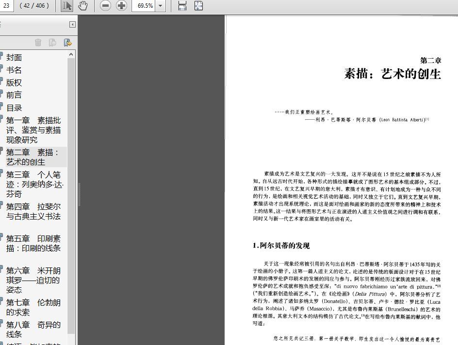 《素描精义:图形的表现与表达》重点分析了达·芬奇、拉斐尔、米开朗琪罗、伦勃朗、皮拉内西、提埃坡罗以及毕加索等艺术家的素描作品,阐述了素描这种媒介本身的历史以及所包含的理论。素描通常被看作是艺术创造中最能反映艺术内在规律的记录,它为我们提供了艺术之美的最直接的表现。