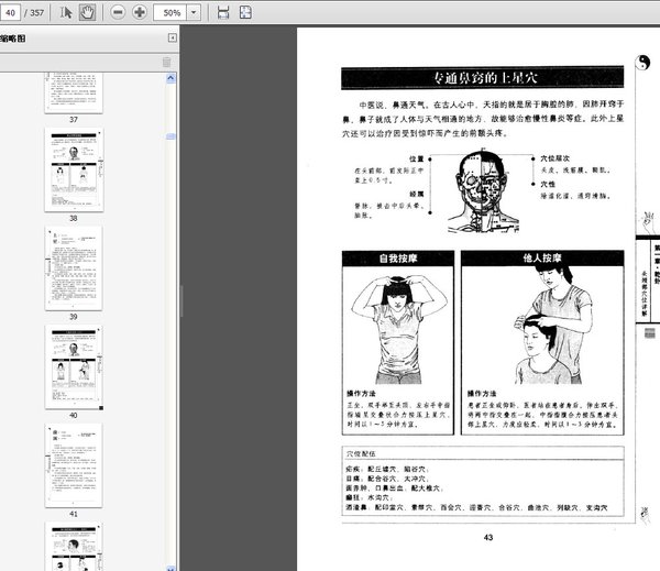 : 总论 按摩与经络概论 第1节 常用按摩手法及按摩禁忌 第2节 人体与八卦 第3节 十二正经 第4节 腧穴 第5节 十二原穴 第6节 五输穴 第一章 乾卦:头颈部穴位详解 百会穴:治疗疾病的首选穴 神庭:神志清明按神庭 上星:专通鼻窍的上星穴 前顶:偏头痛的绝佳良穴 水沟:急救要穴 迎香:鼻子的问题迎香来当家 阳白:眼痛头昏就找它 四白:还你明亮、清澈的双眸 丝竹空:头痛、目眩常按丝竹空 颧髑:面部痉挛不再愁 后顶:一举攻破颈肩腰腿痛 强间:睡觉睡饱,心情转好 哑门:致哑又治哑的哑门穴 风池:为发热、中风排忧解难 率谷:常按率谷, 耳聋失聪不再有 天冲:牙龈肿痛的良穴 翳风:耳聋、耳鸣找翳风 下关:治愈牙疼的良穴 第二章 坤卦:躯干部穴位详解 天突:咳嗽、呕吐、咽喉发炎找天突 膻中:胸闷、心悸按膻中 中脘:胸闷心悸按它就好 神阙:常按神阙穴百病渐消散 气海:按摩气海暖全身 关元:藏经蓄血的隐秘之处 中级:治疗女性不为人知的生理疾病 乳根:让乳房疾病消亡于初始 梁门:不再躲避辛辣美食 天枢:肠胃患病不再急 水道:卵巢早衰不再是梦靥 大横:腹胀、便秘一起治 鸠尾:胃病常犯,鸠尾常按 幽门:解决您的胃部之忧 至阳:快速有效缓解心绞痛 命门:延年益寿不怕衰老 长强:延年益寿缓衰老 大杼:颈椎的保护者 肺俞:呼吸道疾病的救星 膈俞:不再贫血,容光焕发 肝俞:降肝、消怒好良穴 胆俞:中年女性从今远离胆囊炎 脾俞:集美容、减肥、养生于一身的穴位 胃俞:胃黏膜出血不再慌 三焦俞:享受青春,拒绝青春痘 肾俞:延缓衰老、养生固本 气海俞:改善女性压力性尿失禁 大肠俞:腰脊疼痛、肠胃不适一起治 关元俞:隐私部位就找它 上醪:不能弯腰也能治 中骼:治疗腰部酸痛它出力 会阳:阳痿可以悄悄治 魄户:颈椎综合征轻松解决 膏盲:运动膏盲穴,除病一身轻 神堂:攻克心脏疾病的要穴 胃仓:轻松缓解胃溃疡带来的困扰 秩边:男性朋友不能说的秘密 天宗:口腔溃疡的福音 第三章 艮卦:上肢部穴位详解 少商:让秋燥咳嗽远离我们 鱼际:利咽化痰好帮手 太渊:气血不足,太渊相助 经渠:感冒发汗按摩经渠穴 列缺:风寒不再可怕 孔最:失血、止血找孔最 尺泽:攻克支气管炎、肺炎的良穴 侠白:肺经上的英雄 天府:巧按天府穴治鼻炎 中冲:心脏的保护者 劳宫:酷夏不用担心中暑和昏迷 内关:打开心结,养颜养心的美丽穴 郄门:治疗心之疾的一味良穴 曲泽:治疗急性胃肠炎 天泉:心脏病、高血压一起治 少冲:赶走瞌睡虫 少府:治疗心闷有疗效 神门:摆脱失眠困扰 …… 第四章 震、巽卦:下肢部穴位详解 第五章 坎、离、兑卦:耳目口部穴位详解