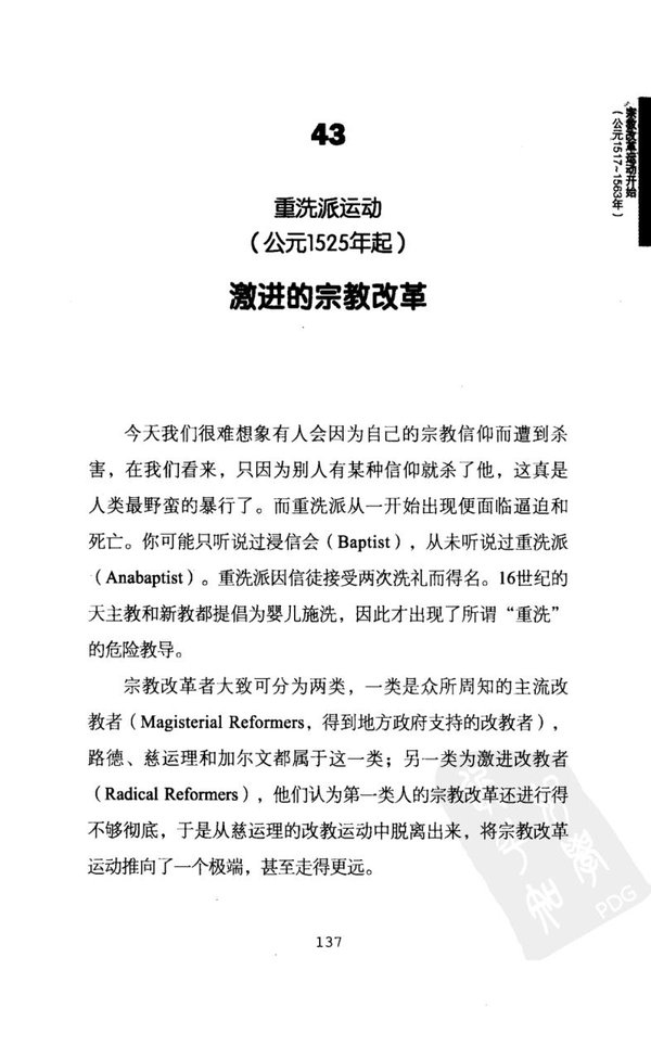 : 第一部分 遭受逼迫的早期教会(公元30~313年) 1.教会的建立(公元30~100年)五旬节、逼迫及破坏 2.殉道者犹斯丁(Justine Martyr,公元100~165年)死亡的别称 / 3.波利卡普(Polycarp Martyred,公元155年)殉道的力量 4.爱任纽(Irenaeus,公元130~200年)驳斥异端 5.特土良(Tertullian,公元160~225年)犀利有力的文笔 6. 俄利根(Origen,公元185~254年)铁人 7. 德西乌斯(Decius)和戴克里先(Diocletian)发起的大逼迫 (公元250~303年)逼迫加剧 8.圣安东尼(St. Antony,公元251~356年)修院鼻祖 9.君士坦丁大帝及“米兰敕令”(公元313年)宗教自由 第二部分 经过考验的早期教会(公元313~590年) 10.优西比乌(Eusebius,公元263~339年)教会历史之父 11.第一次尼西亚大公会议(公元325年)一字定乾坤 12.亚他拿修(Athanasius,公元296~373)反对世界的人 13. 卡帕多西亚的教父们(公元4世纪末期)“卡帕多西亚三杰” 14.安布罗斯(Ambrose,公元340~397年)伟人之师 15. 约翰•克里索斯托(John Chyrsostom,公元347~407年)最伟大的传道人 16.耶柔米(Jerome,公元345~420年)学者中的学者 17.奥古斯丁(Augustine,公元354~430年)从坏小子到伟人 18.帕特里克(Patrick,公元389~461年)既非天主教徒也非爱尔兰人 19.迦克敦会议(公元451年)基督是谁? 20. 努尔西亚的本笃(Benedict of Nursia,公元480~543年)规定制定者 21. 凯尔特人的基督教(公元6~7世纪)爱尔兰之光 / 69 第三部分 中世纪政教合一的教会(公元590~1054年) 22. 大格里高利(Gregory The Great,公元540~604年)教皇的权力 23. 怀特比宗教会议(公元664年)凯尔特人与罗马人的冲突 24.比德(Bede,公元672~735年)可敬的圣徒 25.波尼菲斯(Boniface,公元680~754年)日耳曼人的使徒 26.图尔之战(公元732年)西方的得胜 27.查理大帝(Charlemagne,公元742~814年)巨人国王 28.基督教在俄罗斯(公元988年以后)第三罗马 29.大分裂(公元1054年)大家庭的致命纷争 第四部分 中世纪教会的分裂(公元1054~1517年) 30.安瑟伦(Anselm,公元1033~1109年)专心致志 31. 克莱沃的伯纳德(Bernard of Clairvaux,公元1090~1153年)为了上帝的爱 32.大学的崛起(公元12世纪)学者云集 33. 托马斯•阿奎那(Thomas Aquinas,公元1225~1274年)沉默的公牛 34. 瓦尔多教徒(公元12世纪至今)瓦尔多在哪里? 35. 约翰•威克利夫(John Wycliffe,公元1330~1384年)宗教改革运动的启明星 36.约翰•胡斯(Jan Hus,公元1369~1415年)我愿为真理而死 37.君士坦丁堡的陷落(公元1453年)第二罗马的灭亡 38.古腾堡印刷厂(公元1454年)信息时代的开始 39.伊拉斯谟(Erasmus,公元1468~1536年)路德思想的催生者 / 123 第五部分 宗教改革运动开始(公元1517~1563年) 40.马丁•路德(Martin Luther,公元1483~1546年)“野猪” 41.路德的试炼(公元1521年)虫宴? 42. 乌尔里希•慈运理(Ulrich Zwingli,公元1484~1531年)军牧改革家 43.重洗派运动(公元1525年起)激进的宗教改革 44. 威廉•丁道尔(William Tyndale,公元1494~1536年)英文圣经之父 45. 托马斯•克兰默(Thomas Cranmer,公元1489~1556年)英国的宗教改革 46. 伊格那丢(Ignatius)及其反宗教改革的举措(公元1491~1556年)卷土 重来 47. 约翰•加尔文(John Calvin,公元1509~1564年)宗教改革运动的规划者 48. 天特会议(公元1545~1563年)确立罗马天主教的教义 第六部分 宗教改革运动的继续(公元1563~1648年) 49. 约翰•诺克斯(John Knox,公元1513~1572年)脾气暴烈的苏格兰人 50.胡格诺派(公元16世纪)法国的加尔文主义者 51.浸信会(公元1609年)又一个新教会? 52.英王钦定版圣经(公元1611年)保罗会为之叫好吗? 53.英国清教徒(公元16~17世纪)美国人的先祖 54.威斯敏斯特信条(公元1646年)完美的概括 55.30年战争(公元1618~1648年)旷日持久的战争 56.新英格兰的清教徒(公元1620年起)山上之城 第七部分 理性主义统治时期(公元1648~1789年) 57. 约翰•弥尔顿(John Milton,公元1608~1674年)第二个盲人诗人 58.约翰•欧文(John Owen,公元1616~1683年)清教徒中的伟人 59. 布莱斯•帕斯卡尔(Blaise Pascal,公元1623~1662年)见解独到的思想家 60. 约翰•班扬(John Bunyan,公元1628~1688年)有史以来最伟大的故事 61.敬虔主义者(公元17~18世纪)心灵的宗教 62. 艾萨克•牛顿爵士(Sir Issac Newton,公元1642~1727年)科学革命 63. 摩拉维亚教派(公元1732年)现代宣教运动的诞生 64. 约拿单•爱德华兹(Jonathan Edwards,公元1703~1758年)美国最伟大的 神学家 65. 属灵大觉醒(公元1740年)预备独立 66. 大卫•布莱纳德(David Brainerd,公元1718~1747年)印第安人的使徒 67.约翰•卫斯理(John Wesley,公元1703~1791年)追求完美 68.乔治•怀特菲尔德(George Whitefield,公元1714~1770年)最伟大的布 道家? 第八部分 宣教运动风起云涌(公元1789~1900年) 69.威廉•凯里(William Carey,公元1761~1834年)现代宣教之父 70. 威廉•威伯福斯(William Wilberforce,公元1759~1833年)社会改革家 71.查尔斯•司布真(Charles Spurgeon,公元1834~1892年)讲道王子 72.约翰•巴顿(John Paton,公元1824~1907年)逃离食人族 73. 德怀特•慕迪(Dwight Moody,公元1837~1899年)“疯狂的慕迪” 74.戴德生(Hudson Taylor,公元1832~1905年)入乡随俗的传道人 75.第一次梵蒂冈会议(公元1869~1870年)权柄属于谁? 76.慕拉(Lottie Moon,公元1840~1912年)浸信会宣教团的圣徒 77. 玛丽•斯莱瑟(Mary Slessor,公元1848~1915年)卡拉巴的女王 78. 亚伯拉罕•凯波尔(Abraham Kuyper,公元1837~1920年)一切所有都归 基督 第九部分 第二次世界大战结束前的20世纪(公元1900~1945年) 79.世界宣教大会(公元1910年)从西方到全世界 80.比利•桑戴(Billy Sunday,公元1862~1935年)棒球手布道家 81.基要派与自由派的论战(公元20世纪20年代)走向极