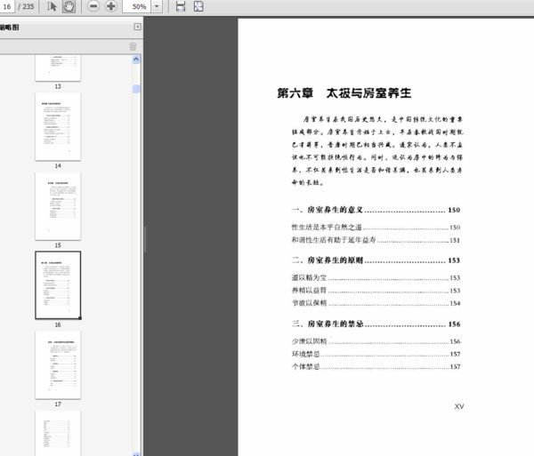 : 第一章 太极与养生 何谓太极?何处是太极?太极之于养生的意义何在?匀从“太极说”问世以来,关于太极的内涵就一直为历代医学家所关注,各家之说也是纷然柰陈。有人说,宇宙是一十大太极,人体是一个小太极;也有人说,人人有一太极,物物有一太极。 一、太极不再是千年难解的谜题 关于陈抟的传说 “太极”一词的由来 小小太极图深藏玄机 人人有一太极 思维中也有太极 太极养生是应对现代生活方式病的法宝 二、养生就是防患于未然 扁鹊与养生 养生重在养阳气 有阳气,才有精、气、神 人体的四种“未病态” 太极养生就是“治未病” 第二章 太极养生真法的内涵 《灵枢·本神篇》就有:“生之本谓之精,两精相搏谓之神”之话。人的生命起源是“精”,维持生命的动力是“气”,而生命的体现就是“神”的话动。所以说精充气就足,气足神就舵;精亏气就虚,气虚神也就少。精是产生神的基础,气为化精的动力,神是精气的 外在表现,太极养生的核心就是养精、补气、调神。 一、太极养生的智慧 太极养生之“人身三宝” 太极养生与“黄金分割” 太极养生与“性命双修” 太极养生与“人体经络” 二、太极养生的特色 太极养生有独特的文化个性 太极养生的九大指导原则 太极养生有其理论与方法 太极养生特色鲜明 第三章 太极养生入门练习 初学者在进行太极养生的入门练习时,要求全身凡是能动的部分,都要同时活动;动作上,既讲宄灵敏,又讲究沉稳安静,避免浮躁;思想上,则要求全神贯法,注意力高度集中;运作过程中,更讲究练习的圆转曲折、自然流畅、引人入胜。这样最终才能达刭调整心理与情绪的目的。 一、太极养生中的动静相宜 太极养生强调以静养生 “入静”的练习法 运动在养生中的作用 有氧运动与无氧运动 二、道家内丹养生法 “小周天”功法 “大周天”功法 “气通周天”与“意通周天” 三、内丹调神与养心术 何谓“内丹” 内丹调神 调神养心的六种方法 内丹练习缔造人体健康 四、太极站桩功 太极内功练习的三个阶段 站桩功——百练不如一站 站桩功的练习方法 五、太极养生操 太极养生操适于忙碌的上班族 在太极养生操中体会静水深流 太极养生操详细图解 太极养生操的八大练习要点 六、24式简化太极拳 太极拳的美学特征——柔、缓、松 太极拳的养生作用 24式简化太极拳详细图解 太极拳的治疗功效 第四章 太极与饮食养生 第五章 太极与四时养生 第六章 太极与房室养生 附录 太极中医学与中医学基础