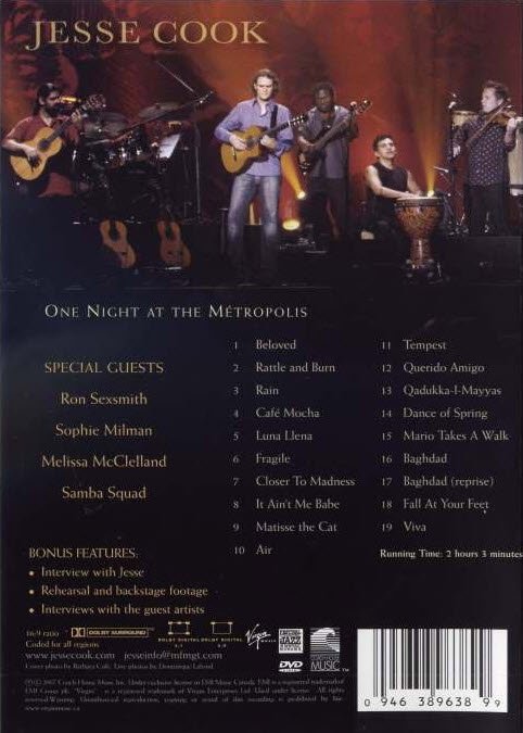 20 of 20 people found the following review helpful 5.0 out of 5 stars As wonderful to watch as it is to hear!, October 28, 2007 By Fred Felts "eightharrow47" (Southern Indiana) - See all my reviews (REAL NAME) Amazon Verified Purchase(What's this?) This review is from: Jesse Cook: One Night at the Metropolis (DVD) I purchased this DVD a while before I watched it. I own all of the Jesse Cook albums with the exception of The Ultimate Jesse Cook (I believe this is a "best of" album). I have been totally blown away by his music since I put the first CD in my machine. Seeing Jesse and the absolutely super musicians he performs with is a must for any fan. If I could rate this DVD twice and total the stars it would get 10. A great audio-visual investment. Help other customers find the most helpful reviews Was this review helpful to you? Yes No Report abuse | Permalink Comment Comment 10 of 10 people found the following review helpful 5.0 out of 5 stars Why doesn't this guy get more attention?, January 25, 2008 By jayfich (Dallas, TX) - See all my reviews This review is from: Jesse Cook: One Night at the Metropolis (DVD) I've listened to Jesse for 3-4 years now but just found out about the DVD and purchased it. I haven't ever seen him "live". This DVD is FANTASTIC!! Superb musicianship, great showmanship, and excellent sound. I really felt like I was there. There are so many great performances and everyone contributing is amazing. Closer to Madness, Tempest, Luna Llena, and It Ain't me Babe are my personal favorites. I can't understand how someone this talented is not more recognized. When you see all of the garbage that gets more attention in the music business and then you see this......you realize what a travesty it is. GREAT DVD!! Help other customers find the most helpful reviews Was this review helpful to you? Yes No Report abuse | Permalink Comment Comments (3) 8 of 8 people found the following review helpful 5.0 out of 5 stars This is it, June 23, 2007 By Carlos R. Umpierre "lobowolfnt" (Salen, MA USA) - See all my reviews (REAL NAME) This review is from: Jesse Cook: One Night at the Metropolis (DVD) if you like MUSIC this is a must have, waooo!!! Mr. Cook (6) stars for you and your band, best DVD your money can buy, you had all my family dancing in the living room. Help other customers find the most helpful reviews Was this review helpful to you? Yes No Report abuse | Permalink Comment Comment 5 of 5 people found the following review helpful 5.0 out of 5 stars Playlist details, April 25, 2008 By RTHawk - See all my reviews Amazon Verified Purchase(What's this?) This review is from: Jesse Cook: One Night at the Metropolis (DVD) I just saw my second Jesse Cook concert and was hoarse from screaming with delight from the performances - especially Chris Church's violin on Closer to Madness and his singing on Fall At Your Feet which brings me to tears it is so beautiful. The group does 2 encores. Jesse is friendly and personable and down-to-earth. Seeing him come to my area only once a year isn't enough hence I bought the DVD. Special Guests: Ron Sexsmith, Sophie Milman, Melissa McClelland, and Samba Squad. Here is the playlist from the DVD: 2 hours and 3 minutes: 1. Beloved 2. Rattle and Burn 3. Rain 4. Cafe Mocha 5. Luna Llena 6. Fragile 7. Closer to Madness 8. It Ain't Me Babe 9. Matisse the Cat 10. Air 11. Tempest 12. Querida Amigo 13. Quadkka-l-Mayyas 14. Dance of Spring 15. Mario Takes a Walk 16. Baghdad 17. Baghdad (reprise) 18. Fall At Your Feet 19. Viva Bonus Features: Interview with Jesse; Rehearsal and backstage footage; Interviews with guest artists. Help other customers find the most helpful reviews Was this review helpful to you? Yes No Report abuse | Permalink Comment Comment 4 of 4 people found the following review helpful 5.0 out of 5 stars THE GOLD STANDARD FOR CONCERT DVDS!!!, December 12, 2008 By Scamp Sid "scamp sid" (Austin, TX USA) - See all my reviews Amazon Verified Purchase(What's this?) This review is from: Jesse Cook: One Night at the Metropolis (DVD) I only recently discovered the music of Jesse Cook early one Sunday morning listening to a jazz radio program. I then saw the DVD on Amazon and decided to roll the dice and order it. Got to say - that was a great decision on my part! The artist, music, sound quality, and video work are all absolutely incredible. I own a lot of concert DVDs but this one is at the top. This is the concert DVD that sets the high water mark! Help other customers find the most helpful reviews Was this review helpful to you? Yes No Report abuse | Permalink Comment Comment 2 of 2 people found the following review helpful 5.0 out of 5 stars A visual and audio feast, March 26, 2009 By Mark Royer "babydell" (Boca Raton, Fl. United States) - See all my reviews (REAL NAME) This review is from: Jesse Cook: One Night at the Metropolis (DVD) Simply put ..this DVD is awesome....If you are a Jesee Cook fan and have seen him live you will absolutely love this DVD. Not only is the set list long, over 2 hours long, it also includes many of the songs from the Frontiers CD. The interplay between Jesse and the violin player is extraordinary!!! As a guitar player myself I really appreciated those close up camera shots on the fingers of Jesse as he was playing. I got this DVD on sale somewhere else shhhhh!! MGR
