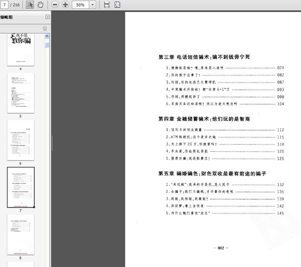 : 第一章 街头骗术:在街头他们是这样骗人的 1.“神医”潜伏在菜市场(1) 2.“神医”潜伏在菜市场(2) 3.我真的不要你们的钱,只要你们帮我们宣传 4.噫,你不是死了吗? 5.大姐,咱俩把这钱分了吧! 6.我是好心帮助他们,可是他们却骗了我 7.碰瓷当道,大家小心 8.车站里那些神奇的骗子 9.一不小心,就可能被卖到山沟沟里 第二章 购物及网络骗术:再精也能骗到你 1.别以为货到付款就安全了 2.裸价陷阱:让你贪便宜 3.无聊了,你就去看电视购物广告吧 4.淘宝:骗子在此集结 5.QQ骗子全玩高科技? 6.对不起,你的机票无法登机 7.运气太好了,天上掉下一张金卡 第三章 电话短信骗术:骗不到钱毋宁死 1.猜猜我是谁?噫,原来是八戒呀 2.你的孩子出事了! 3.你好,你的电话已欠费停机 4.中奖骗术升级啦!都“非常6 1”了 5.你好,你被起诉了 6.买房买车还给退税!你以为老天慈悲啊 第四章 金融储蓄骗术:他们玩的是智商 1.信用卡诈你没商量 2.ATM取款机:这个是非之地 3.天上掉下20万,你敢要吗? 4.手头紧,你也甭乱借款 5.股票诈骗:我是胜算王! 第五章 骗婚骗色:财色双收是最有前途的骗子 1.采花贼:我采的不是花,是人民币 2.女骗子:我们只骗钱,才不要你的色呢 3.我能,我很能,我最能! 4.异国梦:看上去很美 5.为什么她们喜欢“老总” 第六章 求职招聘骗术:找不着工作你找我啊 1.传销年年有,今年特别多 2.明星梦的破灭 3.黑中介:黑的不仅仅是心 4.我炒的不是私单,是人民币 5.鲁迅也有笔名,我就不能用假名? 公众提示警方:谨防骗子 全国各地骗子大汇总 乐一乐:我们是这样整蛊骗子的