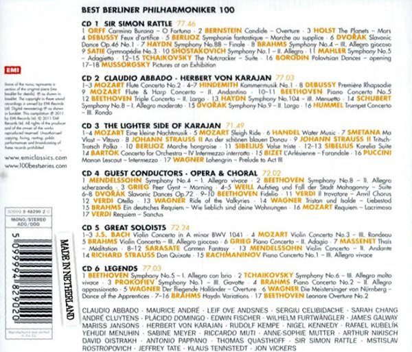 Label:EMI Catalogue No:9482902 Series:100 Best Discs:6 Release date:21st March 2011 Barcode:5099994829020 Length:7 hours 54 minutes Medium:CD Orchestra: Berlin Philharmoniker Audio CD (March 29, 2011) Number of Discs: 6 Format: Box set Note on Boxed Sets: During shipping, discs in boxed sets occasionally become dislodged without damage. Please examine and play these discs. If you are not completely satisfied, we'll refund or replace your purchase. Label: Alliance ASIN: B004NO03BA The first CD of this 6-CD set is devoted to the current Music Director of the Berlin Philharmonic, Sir Simon Rattle, and includes extracts from popular works like Orff's Carmina Burana and The Planets by Holst as well as more substantial works like Mahler's Fifth Symphony and Shostakovich's First Symphony. It also showcases extracts from Rattle's highly acclaimed superb new recording of Tchaikovsky's famous ballet The Nutcracker. CD 2 opens with examples of former Music Director Claudio Abbado's recordings with this great orchestra, including Mozart's Flute Concert No.2 with brilliant soloist Emmanuel Pahud. Following is a group of items conducted by Herbert von Karajan, including Mozart's Concerto for Flute & Harp and Dvorˇák's `New World' Symphony. Continuing with Karajan, the third CD presents a concert of popular works ranging from Mozart's `Eine kleine Nachtmusik' to the spectacular Prelude to Act III of Wagner's Lohengrin. CD 4 begins with several well-known works such as the first movement of Mendelssohn's lively `Italian' Symphony and `Morning' from Grieg's Peer Gynt Suite, all under the batons of guest conductors like Klaus Tennstedt, Jeffrey Tate and Lorin Maazel. These are followed by some spectacular extracts from operas and choral works including the powerful opening scene of Verdi's Otello. CD 5 presents some of the world's greatest instrumental soloists in a range of famous concertos. Violinists Nigel Kennedy and David Oistrakh are heard in Bach and Mozart respectively. Anne-Sophie Mutter plays the beautiful `Méditation' from Massenet's Thaïs and Yehudi Menuhin is heard in Brahms. The great cellist Mstislav Rostropovich gives us a taste of Richard Strauss's Don Quixote and the outstanding Norwegian pianist Leif Ove Andsnes performs works by Grieg and Rachmaninov. The set ends with a collection of recordings by some of the legendary conductors of an earlier time, starting with the first movement of Beethoven's Fifth Symphony made in 1913 by Arthur Nikisch. There are several items by the much-loved Rudolf Kempe, a rarity by the enigmatic Sergiu Celibidache, who made only a handful of commercial recordings, and several of the acclaimed recordings by Wilhelm Furtwängler, who held the post of Music Director twice and was the predecessor of Herbert von Karajan.