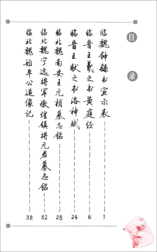 : 临魏钟繇书宣示表 临晋王羲之书黄庭经 临晋王献之书洛神赋 临北魏南安王元桢墓志铭 临北魏宁远将军敦煌镇将元君墓志铭 ......