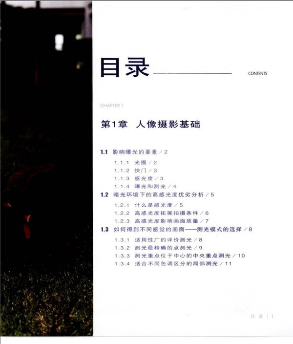 : 第1章 人像摄影基础 1.1 影响曝光的要素 1.2 暗沟环境下的高感光度优劣分析 1.3 如何得到不同感觉的画面——测光模式的选择 1.4 如何控制夜景人像拍摄——白平衡的概念及应用 1.5 如何打造浅景深美女——景深的概念及决定因素 第2章 人像写真摄影的器材选取与运用 第3章 人像摄影必须掌握的相机设置 第4章 人像摄影光影大揭秘 第5章 人像摄影色彩造型 第6章 人像摄影构图 第7章 人像主题摄影 第8章 室内人像摄影 第9章 其他人像摄影