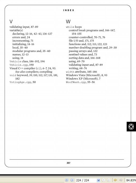 : 1 an introduction to c++ and the c++ progranmming environment 11 variables,operators,and writing programs using sequential statements 27 writing structured ++ programs 41 writing programs that make decisions 65 writing programs using loops 91 using arrays in c++ programs 107 using functions in c++ programs 141 writing control break programs 159 sorting data and file input/output 177 object oriented c++ 197 index