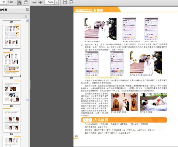 : 第一部分 必备知识热身篇 第1章 认识Photoshop 1.1 调整照片尺寸 1.1.1 放大缩小查看照片 1.1.2 裁切照片 1.1.3 调整照片像素大小 1.2 修复照片中的污点 1.2.1 修复照片中的污点 1.2.2 去除照片中地上的垃圾 1.2.3 修补瑕疵照片 1.2.4 去除人物红眼 1.2.5 复制图像中的花朵 1.3 选择照片中的图像 1.3.1 使用魔棒工具选择简单照片背景 1.3.2 使用钢笔工具选择复杂的图像 1.3.3 使用通道选择人物头发 1.4 合成照片 1.4.1 使用图层混合模式合成照片 1.4.2 添加文字 1.4.3 使用蒙版合成照片 第二部分 软件知识基础篇 第2章 照片的调色 2.1 常用调色技术 2.1.1 调整照片的色相/饱和度 2.1.2 调整照片色阶 2.1.3 调整照片曲线 2.2 调色常用综合技法 2.2.1 调整羽化图像的色阶 2.2.2 使用通道调整颜色 2.2.3 调整出统一色调的照片颜色 第3章 校正照片的常见缺陷 3.1 校正颜色缺陷 3.1.1 人物面部皮肤柔化 3.1.2 去除暗疮和痣 3.1.3 去除人物眼袋 3.2 校正曝光缺陷 3.2.1 校正曝光不足 3.2.2 校正曝光过度 3.2.3 校正逆光效果 3.3 校正焦距缺陷 3.3.1 使图像具有主次感 3.3.2 调整景深效果 第4章 美化人物照片 4.1 形体美化 4.1.1 美瞳效果 4.1.2 脸型改造 4.1.3 修饰人物体态 4.2 改变头发效果 4.2.1 改变人物发型 4.2.2 改变人物发色 4.3 妆容调整 4.3.1 给人物添加唇彩效果 4.3.2 给人物添加眼影 4.3.3 给黑白照片人物上色 第三部分 典型案例应用篇 第5章 婚纱写真 5.1 情定爱情海 5.2 布拉格恋人 5.3 梦幻仙境 5.4 麦田花嫁 5.5 冰激凌恋人 5.6 罗马假日 5.7 浪漫满屋 5.8 重温经典 第6章 艺术写真 6.1 四维世界 6.2 写意中国风 6.3 梦幻洛丽塔 6.4 粉红佳人 6.5 古镇寻芳 6.6 百变丽人 第7章 异域风情 7.1 英伦迷情 7.2 法式浪漫 7.3 东京街头 7.4 吉普赛女郎 第8章 宝贝摄影 8.1 可爱的天使 8.2 淘气小宝贝 8.3 精灵小公主 8.4 成长宣言 第9章 全家福摄影 9.1 快乐进行时 9.2 幸福伴身边 9.3 快乐一生 9.4天伦之乐 第10章 影楼照片的商业应用 10.1 制作电子相册 10.2 制作3D动画 10.3 制作挂历 10.4 制作结婚请柬 10.5 制作X展架