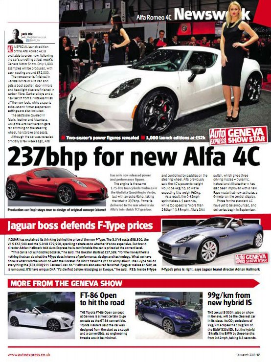 : 8 cover 314mpg vw driven 12 cover fiat panda xl 14 mclaren's 911 rival 17 alfa 4c unveiled 19 sx4 crossover 20 tenault's seven-seat suv 23 best of the rest at geneva 24 adam convertible 32 inside the new f-type 36 cover vauxhall cascada 38 nine-speed evoque 40 sls electric drive 42 rav4 hits britain 45 leon sc tsi 48 cover formula one is back 56 toyota verso vs rivals 64our cars 72 hands-free head-to-head 74 socket sets tested 78 e-class coupe buyer's guide 84 new car prices 96 sport 97 get auto express every week 98 back chat