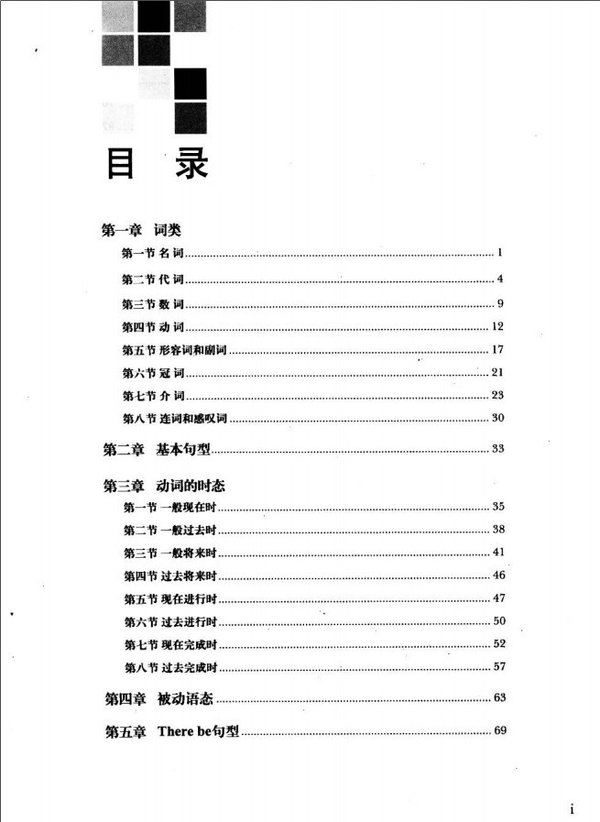 : 第一章 词类 第二章 基本句型 第三章 动词的时态 第四章 被动语态 第五章 复合句