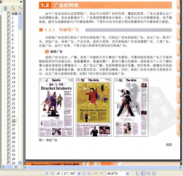 : Chapter 01 平面广告设计必备知识 1 广告概述 1.1.1 广告的定义 1.1.2 广告设计的要素 1.1.3 广告的作用与任务 1.2 广告的种类 1.2.1 印刷类广告 1.2.2 户外广告 1.3 平面广告设计的构成要素 1.3.1 图形与图像 1.3.2 标志 1.3.3 文字 1.3.4 色彩 1.4 广告设计的版面编排 1.4.1 广告版面的编排要求 1.4.2 广告版面的编排原则 1.4.3 广告版面的编排类型 1.5 广告输出的基础知识 1.5.1 分辨率与印刷网线数的关系 1.5.2 裁剪边缘与出血 Chapter 02 Photoshop CS5概述 2.1 Photoshop CS5概述 2.1.1 图像设计 2.1.2 图形绘制 2.1.3 图像编修与美化 2.1.4 网页图像制作 2.2 Photoshop CS5操作界面 2.2.1 默认工作区(基本功能) 2.2.2 切换与自定工作区 2.2.3 自定义键盘快捷键与菜单 2.2.4 新建自定义的工作区 2.3 Photoshop CS5文件管理 2.3.1 新建文件 2.3.2 打开与置入文件 2.3.3 存储文件 2.4 Photoshop CS5的基础操作 2.4.1 还原、前进一步、后退一步 2.4.2 查看画面 2.4.3 使用额外辅助工具 2.5 Photoshop CS5设计必知概念 2.5.1 位图与矢量图 2.5.2 色彩模式 Chapter 03 企业VI设计 3.1 Vi设计的基础知识 3.1.1 认识VI系统 3.1.2 VI系统的广告功能 3.1.3 VI系统的构成要素 3.1.4 VI设计的基本原则 3.1.5 VI设计的操作流程 3.2 珠宝饰品公司VI设计 3.2.1 设计概述 3.2.2 设计企业LOGO 3.2.3 设计信封与信纸 3.2.4 设计名片 3.3 学习扩展 3.3.1 经验总结 3.3.2 创意延伸 3.3.3 作品欣赏 Chapter 04 海报广告设计 4.1 海报设计的基础知识 4.1.1 海报的特点 4.1.2 海报的种类 4.1.3 海报设计的六大原则 4.1.4 宣传海报设计要领 4.2 汽车宣传海报设计 4.2.1 设计概述 4.2.2 设计海报背景 4.2.3 加入汽车素材并美化 4.2.4 制作矢量商务人像效果 4.2.5 设计海报广告文字 …… Chapter 05 房地产DM宣传单设计 Chapter 06 POP广告设计 Chapter 07 报纸广告设计 Chapter 08 杂志广告设计 Chapter 09 包装广告设计 Chapter 10 书籍装帧设计 Chapter 11 交通广告设计 Chapter 12 路牌广告设计
