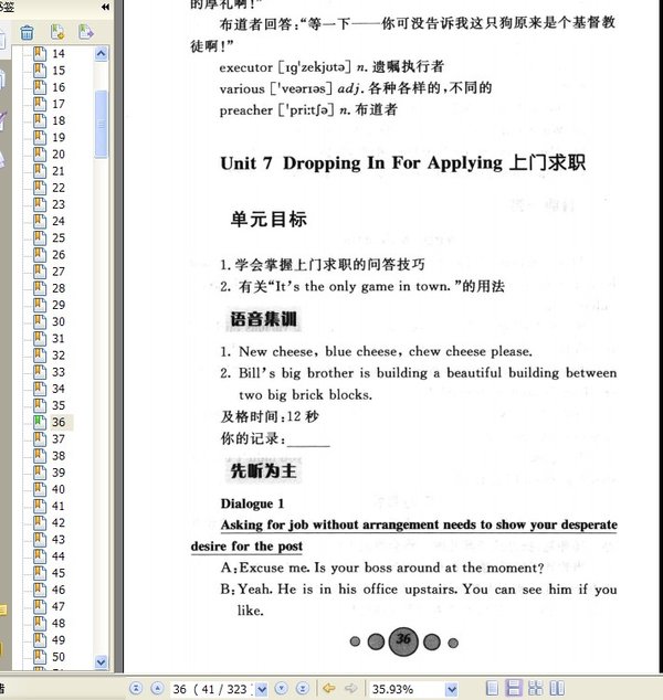 : Chapter 1 For Job-hunting求职准备 Unit 1 Getting Supply & Demand Information获取信息 Unit 2 Applying For Job On The Internet上网求职 Unit 3 Writing Resume写简历 Unit 4 Writing Application Letter写求职信 Unit 5 Writing Recommendation Letter写推荐信 Unit 6 Accepting An Interview Through The Phone电话面试 Unit 7 Dropping In For Applying上门求职 Unit 8 In The Job Agency在职业介绍所 Unit 9 At The Recruitment Fair参加招聘会 Unit 10 About Job-hunter有关猎头 Unit 1l Friends And Relatives’Recommendation亲友推介 Unit 12 Self-recommendation毛遂自荐 Unit 13 Writing Self-recommendation Letter写自荐信 Chapter 2 Preparation For An Interview面试准备 Unit 1 CQ And Career Goal职商与职业理想 Unit 2 Replying To The Call For The Interview回应面试通知电话 Unit 3 3W Making Sure Where,When And Who确定地点、时间和人物 Unit 4 Company’S Background And Post Situation公司背景和职位情况 Unit 5 Corporate Culture企业文化 Unit 6 Etiquette And Taboo礼仪与禁忌 Unit 7 Dressing And Appearance着装与仪表 Chapter 3 Common Questions In An Interview面试常见问题 Unit 1 Personal Information个人信息 Unit 2 Educational Situation教育情况 Unit 3 Work Experiences工作经历 Unit 4 Work Achievements工作成就 Unit 5 Career 0bjectives工作目标 Unit 6 Reasons For Quilting And Applying For The Post辞职与应聘原因 Unit 7 Salary And Renumeration薪金报酬 Unit 8 Benefit And Treatment福利待遇 Unit 9 Contract And Rights合约与权益 Unit 10 Imitating The Working Environment模拟工作 Unit 11 Closing The Interview结束面谈 Chapter 4 Communicating With The Interviewer与主考官“过招” Unit 1 Answering Questions With Skills巧妙应答 Unit 2 Pressure Test压力型测试 Unit 3“Random”Interview“随意型”面试 Unit 4 Asking Questions Properly适时提问 Unit 5 Body Language肢体语言 Unit 6 Recognizing The Traps识破陷阱 Unit 7 Getting Out Of The Mistakes走出误区 Chapter 5 After The Interview面试结束后 Unit 1 Interview Tracking面试跟踪 Unit 2 Writing Thank—you Letter写感谢信 Unit 3 Accepting The Recruitment接受录用 Unit 4 Rejecting The Recruitment谢绝录用 Unit 5 Job-hunting Websites求职网站 Chapter 6 Practical Rehearsal实战演练 Unit 1 Secretary秘书 Unit 2 Salesman销售员 Unit 3 Tour Guide导游 Unit 4 Nurse护士 Unit 5 Accountant会计师 Unit 6 Assistant助理 Unit 7 Editor编辑 Unit 8 Translator翻译 Unit 9 Trademan外贸人员 Unit 10 Bank Teller银行职员 Unit 11 Stewardess空姐 Unit 12 Advertising Planner广告策划人 Unit 13 Customs Officer海关人员 Unit 14 Technician工程人员