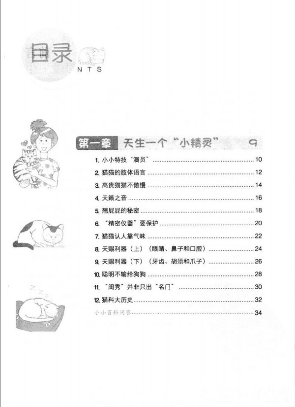 : 第一章 天生一个“小精灵” 1.小小特技“演员” 2.猫猫的肢体语言 3.高贵猫猫不傲慢 4.天籁之音 5.翘屁屁的秘密 6.“精密仪器”要保护 7.猫猫认人靠气味 8.天赐利器(上)(眼睛、鼻子和口腔) 9.天赐利器(下)(牙齿、胡须和爪子) 10.聪明不输给狗狗 11.“闺秀”并非只出“名门” 12.猫科大历史 小小百科问答 第二章 猫猫的地盘谁做主 1.猫狗同养要细心 2.巧妙化解新旧猫的矛盾 3.爱自己≠自私 4.都是纵容惹的祸 5.超有效沟通法 6.挠挠“七寸” 7.明辨忠奸 8.到底谁才是“宠物” 9.抱猫也要讲方法 10.就是爱清洁 11.老猫房上睡 小小百科问答 第三章 轻松应对恼人小问题 1.来一针,保平安 2.恼人的攻击行为 3.阻击不良情绪 4.猫猫也会“发神经” 5.跳蚤,跳蚤,哪里藏 6.肚里有虫心发慌 7.解密猫猫吃草 8.图解“大毒草” 9.也要“清扬”一辈子 10.定期帮猫猫“美甲” 11.警惕四大人猫共患病(上) 12.警惕四大人猫共患病(下) 13.老了更要爱 14.温情收养流浪猫(上) 15.温情收养流浪猫(下) 16.分季节巧呵护 小小百科问答 第四章 离不开你——食物 1.猫宝宝的“饭碗” 2.不做“饱死鬼” 3.健康猫猫不偏食 4.猫猫也应减肥 5.针对特性补充营养 6.猫粮中的“可疑分子” 7.换牙的猫猫吃什么 8.猫宝宝饮食别大意 9.DIY猫罐头 10.白水煮肉调节饮食 11.过去的猫猫吃什么 小小百科问答 第五章 妩媚母猫那些事儿 1.俺的郎君俺有谱 2.不发情“有文章” 3.绝育八大注意 4.细心照料准猫妈 5.迎接新生命 6.主人来当“助产师” 7.猫妈妈“坐月子” 8.吃掉孩子“等于”保护吗 9.没妈的孩子有人疼(上) 10.没妈的孩子有人疼(下) 11.家有“儿女”初长成(上) 12.家有“儿女”初长成(下) 13.孩子们去哪儿了 14.猫妈妈也绝育 小小百科问答 第六章 猫猫急救站 结束语 关注明天,珍爱生命