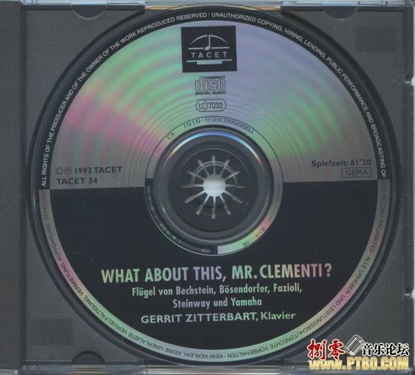 在这张为喜爱钢琴音韵的发烧友所量身订做的示范片中,Tacet找来『贝却斯坦』Bechstein、『贝森朵夫』Bosendorfer、『法齐欧里』Fazioli、『史坦威』Steinway以及『山叶』Yamaha…等五款尊贵的《演奏型》名琴共同为本片「献声」,除了专业水准之外,这几台钢琴的身价可真的不是闹着玩的,动辄数千万的行情叫人不经瞠目结舌,光是一台Fazioli的纯手工限量琴,就值一栋价值千万的豪宅了,那更不用说这五台名琴的总价值了。 这张专辑的创意之处就在于一来可以让爱乐者了解不同钢琴厂牌的声音特色,二来也展现了Tacet录音品质的精细。曲目的选择编排上,先以1943年完成的三乐章作品「这样如何?克莱曼第先生」当作测试曲目,分别让不同款钢琴表现。之后,再挑选最能发挥各家琴音特色的作品,让它们各自表现,场面精采万分。 担纲本片演奏者的是钢琴家『格瑞特.齐特巴尔特』,1952年生于哥廷根。七十年代全球与各大乐团都有合作经验,并曾经获得汉诺瓦、苏黎士、以及佛罗伦斯等地的钢琴大奖。1976年『格瑞特.齐特巴尔特』开始担任「阿贝格三重奏」乐团中钢琴手一职,该团所灌录的唱片获奖无数,更多次赢得德国录音评论室内乐类大奖。 他另外在Tacet还灌录有莫扎特、贝多芬、萧邦的钢琴作品。除了精湛的琴艺表现之外,Tacet在录音方面也特别以两支Bruel & Kjar 4003、两支Schoeps CMC 5 MK2 经典麦克风,以及Sony PCM 2000 数类转换器来进行录音,真实感无以复加。这绝对是张物超所值的发烧天碟,价值连城的演奏名琴,加上顶级专业的录音器材,在过去您可能要远渡重洋托朋友从国外带回来,或是花上大把的钞票在网络上订购,但是现在您真的只需几百块钱就可以轻松松松地带回家享受了。它不但是钢琴音乐爱好者应该加以收藏的极品,同时也是所有音响发烧友用来训练耳力的最佳测试材料,错过了无疑会是您这辈子最难受的缺憾。(网摘,感谢原作者!)