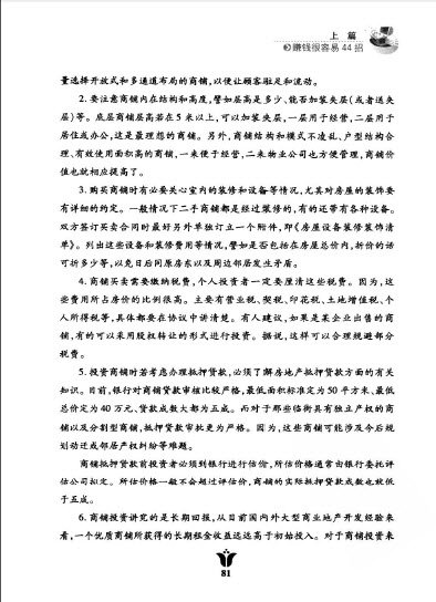 : 上篇 赚钱很容易44招 1.储蓄是防守,投资是进攻3 2.活期储蓄是孩童时就要学的功课5 3.定期储蓄收益不高但风险最小8 4.最热门的超短期通知存单10 5.外币在银行里巧生钱12 6.买国债省心省力还赚钱16 7.购买公司债券要当心19 8.数千种理财产品,总有一款适合你22 9.生财先守财,债券型理财产品最稳妥24 10.信托型理财产品让你轻松赚钱26 11.票据型理财产品风险小收益高29 12.QDII理财产品给你带来惊喜31 13.买保险,买保障,买安心34 14.保单分红,理财有道,稳健增值37 15.万能险有收益也有风险39 16.“投连险”要的就是“双保险”41 17.不要等快退休时再买养老险45 18.这个“基”是只能下“金蛋”的鸡48 19.债券型基金有红利还有增值5l 20.到海外市场淘金的QDII基金54 21.基金定投最好选择指数基金55 22.偏股票型基金风险虽大收益也高58 23.股市博弈能赚钱、赚快钱60 24.期货可获得暴利也可造成巨亏64 25.炒外汇就这么简单67 26.盛世购房,乱世藏金70 27.购买住宅楼最适合中小投资者74 28.买写字楼是不错的选择76 29.只要有耐心,商铺绝对能超值78 30.买个车位出租很HAPPY82 31.具有魔力的炒黄金85 32.彩票可以玩但不能成瘾87 33.永不过时的投资:宝石90 34.金银有价玉无价:玉石收藏93 35.长线投资书画,会收到意想不到的效果96 36.招贴画:市场行情值得期待99 37.“文革”遗物将成为收藏的宠儿101 38.投资小邮票,获得大收益103 39.“玩钱”者如何“让钱生钱”105 40.纪念币收藏中蕴涵大投资机会109 41.雾里看花的古玩收藏111 42.最赚钱也最费钱的瓷器收藏115 43.小小电话卡,收益也很大118 44.连环画是金矿,就看你淘不淘120 下篇 省钱很简单44招 1.日常开支要精打细算127 2.省钱重点是量人为出130 3.家庭理财“AA制”好处多132 4.合理避税,减少支出136 5.夫妻理财幸福省钱138 6.恋爱男女快乐省钱142 7.典当行解你燃眉之急145 8.典当行淘宝精打细算147 9.用好信用卡,省钱有高招150 10.节假日刷卡省钱妙招153 11.开心省钱过大年156 12.人情往来心中有数158 13.既要省钱又要吃出健康160 14.少生病,少花钱;不生病,不花钱163 15.看病不花冤枉钱166 16.健身运动也能巧省钱170 17.怎样兑换外币更加划算173 18.贷款买二手房是否划算176 19.装修房子省钱有妙招179 20.租房和买房哪个更划算182 21.贷款买车是否划算184 22.花最少的钱买高性价比的车186 23.汽车排量小费用自然少189 24.养车少花钱其实很简单192 25.怎样买汽车保险更省钱195 26.日用品,小账也要勤算198 27.买200送100划不划算200 28.小女子化妆品省钱有高招203 29.学会网上购物更省钱206 30.租来的生活很HAPPY 209 31.二手生活省钱又惬意212 32.旅游省钱全攻略216 33.出境游省话费绝招219 34.结婚如何能省钱221 35.租婚车如何省钱223 36.婚纱照既省钱又漂亮227 37.育儿用品省钱妙招大搜集229 38.夏日空调如何更省电232 39.大件家电省电的妙招234 40.小家电节电就是省钱237 41.打电话省钱的方法240 42.选购电脑如何更省钱242 43.手机电池如何省电245 44.打手机如何省钱247
