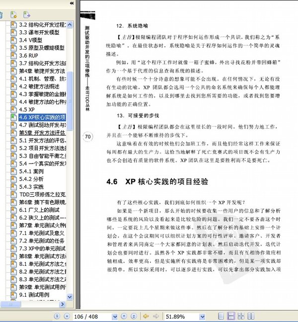 : 混沌篇 丛林中的TDD神火之光 丛林中的TDD神火之光 丛林中的TDD的光芒——看上去很美 TDD的实践故事开始了 金字塔上神像的光芒四射是因为金字塔的伟岸 开天篇 一个简单的胜利 第2章 TDD基础——一个简单的胜利 2.1 什么是TDD 2.2 TDD的步骤,战略上蔑视 2.3 战术上重视 2.4 一个简单的胜利,TDD的简化示例 2.5 TDD的光芒 2.5.1 TDD带给开发人员什么 2.5.2 TDD带给管理者什么 2.6 光芒之下的TDD实践丛林 2.7 还原TDD,懂得总结是最大的财富 2.8 丛林生存法则的吉祥三宝:罗盘、火种、宝剑 TDD三项修炼之克罗托篇 转动“结构化”和“敏捷”的罗盘 第3章 结构化开发方法 3.1 软件开发过程及生命周期模型 3.2 结构化开发过程方法概述 3.3 瀑布开发模型 3.4 v模型 3.5 原型及螺旋模型 3.6 RUP 3.7 结构化开发方法的质量保证及裁剪 第4章 敏捷开发方法 4.1 机制、管理、技术创新的敏捷方法 4.2 敏捷方法概述 4.3 掌握敏捷的金箍棒 4.4 敏捷方法的七种兵器 4.5 XP 4.6 XP核心实践的项目经验 4.7 测试驱动开发与XP 第5章 开发方法评估,踏入平衡之美自由道路 5.1 开发方法的评估、比较及项目应用 5.2 项目开发方法选择及过程定义经验 5.3 自由智能平衡之美的开发方法 5.4 一个真实的开发项目案例 5.4.1 案例 5.4.2 分析 5.4.3 实践 TDD三项修炼之拉克罗斯篇 单元测试之星火燎原 第6章 摘下有色眼镜后的测试 第7章 单元测试火的力量 第8章 单元测试方法谈 第9章 单元测试用例设计 第10章 单元测试工具实践图谱 第11章 自动化测试与每日构建 TDD三项修炼之阿特罗波斯篇 练就重构的精妙剑术 第13章 重构时机 第14章 重构塑型 第15章 意图导向编程 TDD升华篇 丛林中哲人的足迹 第16章 User Story纪事 演练篇 丛林中看到了另一片天空 第17章 演练 第18章 再次演练,一个真实的项目 豁然开朗篇 蓝天白云下的幸福 第19章 走出TDD丛林 附录A 某公司的系统测试流程 附录B 测试过程中的各种文档 附录C 以C++/C为例的代码审查表 参考文献