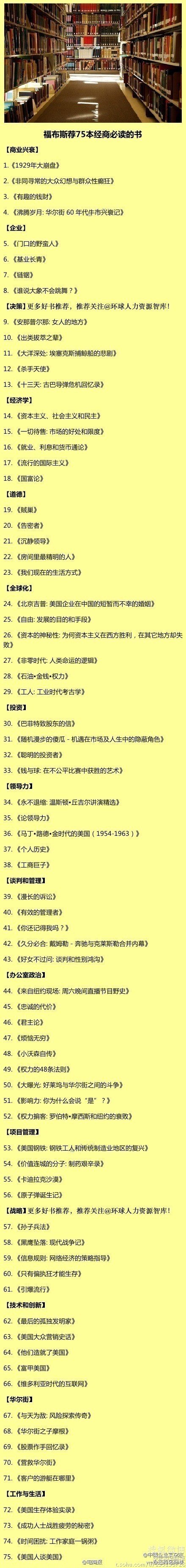 38. 《工商巨子》(Titan: The Life of John D. Rockfeller Sr.),荣•切尔诺(Ron Chernow)著,1998 年出版(中译本由海南出版社出版)。如果这 75 本书不幸被烧,而你只能抢救一本的话,可能就是这本书。这部人物传记和他的主人公一样有影响力。