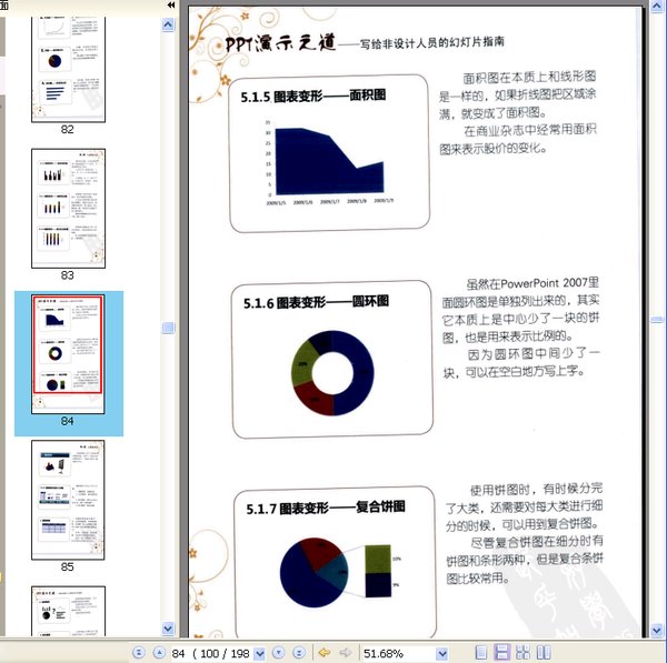 : 第1章 PPT入门 2 1.1 PPT是什么.3 1.2 PPT的用途.3 1.3 PPT为什么被误用4 1.4 对策.5 1.5 PPT设计中的十大问题.6 第2章 设计原则. 12 2.1 两项基本原则13 2.2 视觉化的三个优势.17 2.3 视觉化的两个类别.18 2.4 视觉化的两个要点.19 第3章 PPT制作. 22 3.1 制作PPT的三大步骤23 3.2 PPT制作的准备内容27 PPT演示之道——写给非设计人员的幻灯片指南 3.3 PPT的组成要素.29 3.4 PPT的结构.33 如何编辑图片?——缩放.43 如何编辑图片?——裁剪.44 如何编辑图片?——去背.45 如何编辑图片?——形状填充46 如何搜索剪贴画?47 如何编辑剪贴画?49 SmartArt简介.51 如何让要点一条条显示?.53 第4章 视觉思维. 56 4.1 什么是视觉思维.57 4.2 视觉思维四步走.57 4.3 视觉思维和PPT设计59 4.4 视觉思维训练59 4.5 如何获得灵感69 4.6 如何提高视觉思维能力70 4.7 文化差异.72 4.8 思维导图.72 4.9 Graphic facilitation75 如何用PPT画简笔画?76 第5章 让图表说话 80 5.1 图表类型81 5.2 图表制作.85 5.3 图表美化.91 5.4 图表图片化95 5.5 图表动画.97 如何进行图片填充?——设置数据系列格式98 如何设置图片透明度?——设置形状格式99 如何设置图表动画?——好用的擦除效果100 第6章 设计进阶.102 6.1 文字.103 6.2 背景107 6.3 配色109 6.4 图文搭配.114 6.5 设计原则 116 6.6 多媒体设计的七个原则120 6.7 风格122 如何让字在照片上清晰可见?——形状填充123 如何添加相同的元素?——母板.125 如何快速对齐单个页面上的元素?——对齐127 如何快速复制?——快捷键和格式刷.128 如何对齐多页面上的元素?——网格和参考线.129 第7章 演示技巧.132 7.1 准备工作133 7.2 十大演示技巧.135 7.3 讲义138 7.4 10/20/30法则140 7.5 Toastmasters简介.141 如何插入声音?151 如何插入视频?.153 PPT演示之道——写给非设计人员的幻灯片指南 PPS格式和声音嵌入?.155 如何制作讲议?157 第8章 资源库.160 8.1 如何提高PPT的设计能力.161 8.2 PPT设计资源.162 8.3 图片资源.166 8.4 视觉思维资源168 8.5 图表资源.170 8.6 演讲视频.172