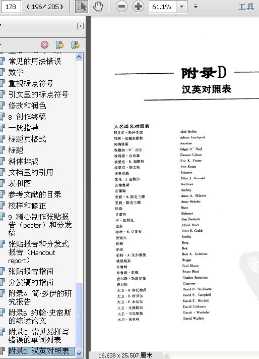 : 1 如何开始 从哪里开始 用APA格式写作 教师的期待 关注你的目标 时间安排 选题 “收窄”题目 了解你的读者和题目 培养理解力 2 查找和使用参考资料 从玛雅的肩膀上向前看 使用在线目录(the Online Catalog) 使用心理学文摘(PsycINFO) 心理学全文期刊数据库(PsycARTICLES)、心理学全文数据库书籍 (PsycBOOKS)和心理学灰色文献(PsycEXTRA) 使用数据追踪库大学版(InfoTrac College Edition) 运用其他电子数据库的小建议 打印图书馆的资源 在图书馆做笔记 资源的信度 开始文献查找的特别建议 图书馆和电子邮件规范 3 拟订研究计划 研究计划的目标 综述性论文的研究计划 实验研究的研究计划 伦理道德因素 韶光易逝 4 计划撰写研究报告 三种宽泛的研究类型 研究计划的基本结构 摘要 引言 方法 结果 讨论 参考文献 结尾材料 组织你的思路 5 综述论文的组织 为什么需要一份提纲 从哪里着手 粗略的大纲 形成一致性 将自己的观点有序地罗列 写作模板和记笔记 开始的策略 事后提纲 6 交流统计信息 四字方针:CAPE 清晰地报告出统计结果 准确地报告结果 精确地报告结果 报告足够的信息 深挖结果 推荐阅读书目 7 写作和润色 整理你的资料 自我激励的目标 开篇 专心写作 写作和报告的伦理规范 避免抄袭 惰性写作 语气 非性别歧视的语言 语态 动词时态 主语和动词一致 常见的用法错误 数字 重视标点符号 引文里的标点符号 修改和润色 8 创作终稿 一般指导 标题页格式 标题 斜体排版 文档里的引用 表和图 参考文献的目录 校样和修正 9 精心制作张贴报告(poster)和分发稿 张贴报告和分发式报告(Handout report) 张贴报告指南 分发稿的指南 附录A 简·多伊的研究报告 附录B 约翰·史密斯的综述论文 附录C 常见易拼写错误的单词列表 附录D 汉英对照表