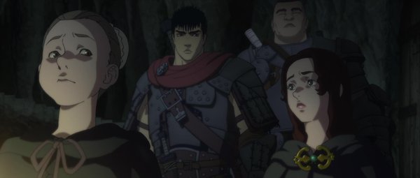 千钧一发时刻,格斯突然出现,以其千军莫敌的强悍实力击退施拉特。从卡思嘉的口中,他听说了自己离开后围绕鹰之团所发生的一切。而以此为契机,这名鹰之团不可或缺的标志性悍将正式回归。在公主夏洛特(丰崎爱生 配音)的暗中协助下,格斯、卡思嘉一行潜入米特兰王国要塞城市温达姆中最古老的建筑物“再生之塔”,格里菲斯便囚禁在塔的最底层。眼前的一幕令格斯等人大为震惊,曾经不可一世的格里菲斯遭受了长达一年的残酷拷问和虐待,他四肢、跟腱悉数割断,连舌头也惨遭拔除。感知到格斯和卡思嘉同情的目光,格里菲斯的意志被彻底打垮。在极度绝望之际,消失很久的霸王之卵贝黑莱特重返格里菲斯手中,而216年一次的蚀之刻也由此开启。云出日没,凶相频现,伴随着贝黑莱特刺耳的尖叫,来自异次元的守护天使神之手降临人间。情愿丢掉一切的格里菲斯将自己奉献给神之手,降魔仪式拉开序幕,难以计数的邪恶使徒对鹰之团的战士展开血腥残酷的屠戮与啮噬。恶魔的盛宴,人间迎来最为黑暗的一刻……