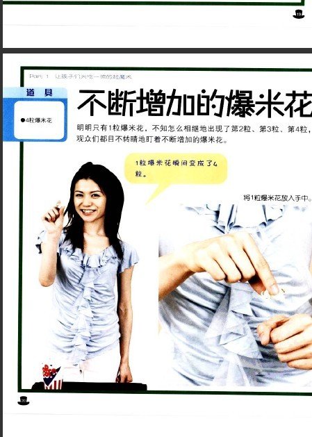 : 欢迎来到超魔术的世界 本书的使用方法 本书使用的道具 超魔术:你的眼睛欺骗了你 Part 1 让孩子们大吃一惊的超魔 压缩铅笔 可以长长的五指 会吃挖耳勺的耳朵 拿不起来的杯子 不断增加的爆米花 在手中消失的扑克牌 会飞的盘子 能穿过手绢的铅笔 能复活的绳子 能变成糖果的润唇膏