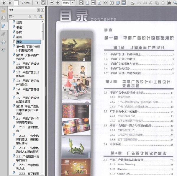 : 前言 第一篇平面广告设计的基础知识 第1章了解平面广告设计 1.1平面广告设计的基本概念 1.2平面广告设计的特点 1.3平面广告的媒体与类型 1.4平面广告的任务 1.5平面广告设计的基本流程 第2章平面广告设计中主要设计元素表现 2.1平面广告中色彩情感与表达 2.1.1色彩的概念 2.1.2广告中色彩的传达、识别和象征作用 2.1.3广告中色彩对人心理的影响 2.2广告版面中文字的编排 2.2.1文字的排列方式 2.2.2文字的版面运用和技巧 2.3平面广告版面中图片与图形的编排 2.3.1图像的比例分布 2.3.2去底图与特写图的运用 2.3.3文字与图形的混排 2.4案例分析 第3章广告设计的软件需求 3.1平面广告软件的认识和选择 3.1.1AdobePhotoshop 3.1.2Illustrator 3.1.3CorelDRAW 3.2PhotoshopCS4的基础知识 3.2.1PhotoshopCS4的操作环境 3.2.2PhotoshopCS4的屏幕模式 3.2.3PhotoshopCS4图像的文件格式 3.2.4PhotoshopCS4的基本操作命令 3.3PhotoshopCS4主要功能运用 3.3.1选区的运用 3.3.2图层蒙版的运用 3.3.3通道的运用 3.3.4抠图的高级技法运用 第二篇Photoshop在平面广告设计中的应用 第4章标志设计 4.1认识标志设计 4.1.1标志设计的概念 4.1.2标志设计的表现形式 4.1.3标志设计的风格分类 4.1.4标志设计的应用 4.2旅行社标志的实例设计和制作 4.3地产标志的实例设计和制作 4.4音乐酒吧标志的实例设计和制作 4.5习题制作 第5章海报设计 5.1认识海报设计 5.1.1海报设计的理论和欣赏 5.1.2海报设计的规格和类型 5.1.3海报设计的图形要素和色彩搭配 5.2音乐海报的实例设计和制作 5.3电影海报的实例设计和制作 5.4化妆品海报的实例设计和制作 5.5公益海报的实例设计和制作 5.6习题制作 第6章杂志广告设计 6.1认识杂志广告设计 6.1.1杂志广告设计的理论和欣赏 6.1.2杂志广告设计的表现形式 6.1.3杂志广告设计的风格分类 6.1.4杂志广告设计的应用 6.2手表杂志广告的实例设计和制作 6.3手机杂志广告的实例设计和制作 6.4液晶屏杂志广告的实例设计和制作 6.5化妆品杂志广告的实例设计和制作 6.6习题制作 第7章报纸广告设计 7.1认识报纸广告 7.1.1报纸广告的广告效应与定位人群 7.1.2报纸广告的规格 7.1.3报纸广告的版面划分和印刷 7.2家居城活动促销报纸广告的实例设计和制作 7.3汽车报纸广告的实例设计和制作 7.4房产报纸广告的实例设计和制作 7.5空调促销报纸广告的实例设计和制作 7.6习题制作 第8章画册设计 8.1认识画册设计 8.1.1画册设计的理论和欣赏 8.1.2画册设计的类型 8.1.3画册设计的制作要素 8.1.4画册设计的主要设计流程 8.2儿童摄影画册的实例设计和制作 8.3珠宝画册的实例设计和制作 8.4习题制作 第9章插画广告设计 9.1认识插画广告设计 9.1.1插画设计的概念和欣赏 9.1.2插画在平面广告设计中的应用 9.1.3插画广告设计的表现形式 9.2餐厅宣传海报设计中插画的应用 9.3咖啡厅店内海报设计中插画的应用 9.4儿童图书中插画的应用 9.5习题制作 第10章网页设计 10.1认识网页设计 10.1.1网页设计的理论和欣赏 10.1.2网页设计的定位 10.1.3网页设计的分类 10.1.4网页设计的设计要素 10.2摄影网页设计的实例设计和制作 10.3伊哟在线电影网页设计的实例设计和制作 10.4旅游公司网页设计的实例设计和制作 10.5习题制作 第三篇Photoshop在立体广告设计中的应用 第11章户外广告设计 11.1认识户外广告设计 11.1.1户外广告设计的理论和欣赏 11.1.2户外广告设计的定位 11.1.3户外广告的分类 11.1.4户外广告的制作要素 11.2房产路牌广告的实例设计和制作 11.3汽车站台广告的实例设计和制作 11.4SONYMP5灯箱广告的实例设计和制作 11.5习题制作 第12章售点广告设计 12.1认识售点广告 12.1.1售点广告设计的理论和欣赏 12.1.2售点广告的特点与定位人群 12.1.3售点广告的分类 12.1.4售点广告的使用价值 12.2品牌服装橱窗广告的实例设计和制作 12.3运动鞋店外橱窗广告的实例设计和制作 12.4酒品促销POP售点广告的实例设计和制作 12.5习题制作 第13章书籍装帧设计 13.1认识书籍装帧设计 13.1.1书籍装帧设计的理论和欣赏 13.1.2书籍装帧设计的分类与要素 13.1.3书籍装帧的使用价值 13.2艺术图书封面的实例设计和制作 13.3时尚杂志封面的实例设计和制作 13.4习题制作 第14章包装设计 14.1认识包装设计 14.1.1包装设计的理论和欣赏 14.1.2包装设计的广告效应 14.1.3包装设计的要素 14.2月饼包装的实例设计和制作 14.3CD包装的实例设计和制作 14.4习题制作