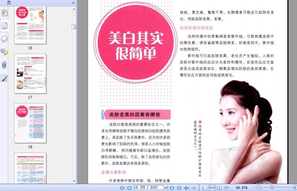: 第1篇 美丽,女人一生的事业 第一章 美肤从了解肌肤开始 自测:你属于什么类型的肌肤 美白其实很简单 皮肤变黑的因素有哪些 美白要从细节开始 保湿补水是美肤的关键 皮肤干燥缺水的4个原因 内外补水最有益 做水润美人需注意 将祛斑进行到底——坚决不做斑美人 斑的类型及成因 祛斑的医学方法有哪些 防皱祛皱——让肌肤呈现不老神话 了解皱纹 皱纹形成的原因 防皱的6种方法 不同年龄有着不同的祛皱原则 收缩毛孔——做紧密细致女人 皮脂型毛孔粗大 角质肥厚型毛孔粗大 色素沉淀型毛孔粗大 美丽宣言——只要青春不要痘 战“痘”的青春怎样度过 预防痘痘的8条原则 痘痘不可以抠和挤 让人惊讶的痘痘真面目 消灭痘痘的实战计划 专题1 如何清洁面部T型区 专题2 化妆让你变得更加迷人 第二章 呵护你全身的每一个角落 自测:我们的爱美指数有多高 美眼——拥有一双明眸 黑眼圈的产生 眼部容易产生细纹的原因 眼部脂肪粒是怎样产生的 20岁眼部保养三部曲 你是哪种黑眼圈 睡前保养能有效消除眼袋 缓解黑眼圈的方法 护唇——秀出红润水嫩的性感 唇部陋习知多少 正确的唇部护理 美发——让乌黑亮丽的秀发牵动众人的目光 挑选优质洗发露的原则 洗头的正确步骤 吹风机正确使用的方法 美颈——塑造优美的颈部曲线 颈部的日常保养不能忽视 运动能解救你僵硬的颈部 按摩是最简单的美颈方法之美颈运动 瑜伽美容瘦身教你练 美手——纤纤玉手美起来 清洁手部要谨记哪些细节 手肘保养不要忽略 夏季护手秘招 手指运动能让双手变美丽 美足——让你拥有秀气白皙的双足 补充足够水分,摆脱足部干裂 去掉厚茧硬皮,脚部才能细嫩 足部肤色要均匀 没有脚臭才能减少尴尬 适合自己做的足疗养护 专题3精油按摩呵护全身 第三章 特殊人群护肤有道 自测:你是否属于敏感肌肤型 白领族——呵护肌肤,保养有道 有效补水让妆容更服帖 防范电脑危害的重要性 浓妆族——无限闪亮的美感肌肤 浓妆族对护肤品有要求 卸妆的注意事项是什么 旅行族——旅途中防晒补水最重要 旅行是一种生活方式 出行的护肤原则 专题4少女族护肤 专题5孕妈妈护肤原则 第四章 让运动留住美丽 自测1你的运动观念 自测2你的肌肤是否缺氧 美丽新概念——今天你做面操了吗 年轻女性的面操八节 中老年女性的面操五节 无龄美肌按摩法 保养皮肤——选对正确的运动方式 运动方式——游泳 运动方式——羽毛球 运动方式——爬楼梯 运动方式-一仰卧起坐 运动方式——健步 瑜伽美容瘦身教你练 怎样拥有健康的胸部 能使胸部丰满的运动 有效提拉胸部的运动 勾勒完美胸部曲线的运动 紧实胸肌,重塑挺拔胸肌的运动 缓解背痛——小动作,大作用 背部僵硬 颈椎痉挛 弯腰受限 剧烈疼痛 女性各个部位保健操 查看你的装备是否齐全 保健操前的必知事宜 脚踝练习 肩颈练习 手臂练习 手腕练习 髋关节练习 反握手腕胸前翻转 专题6多蹲少坐有益健康 专题7温软而有韧性的瑜伽操 第2篇 生活饮食与女性美丽息息相关 第一章 饮食与女性的美丽和健康 自测1 你的饮食是否合理 自测2 你的压力指数 自测3 你肥胖的可能性 自测4 你是否有神经衰弱 吃出美丽,吃出健康 多食五谷杂粮是健康基础 健康生活与蔬菜的关系 女人水灵离不开水果 …… 第3篇 女性美丽与特殊部位的呵护不可分割 第4篇 女性与亚健康及妇科疾病 第5篇 关注女性心理健康与心理保健