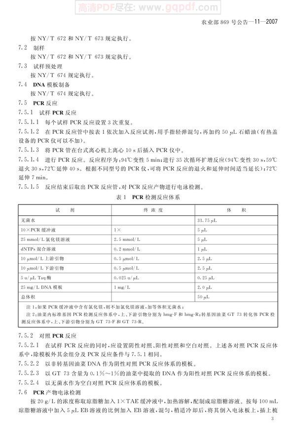 农业部869号公告-11-2007 转基因植物及其产品成分检测 抗除草剂油菜GT73及其衍生品种定性PCR方法