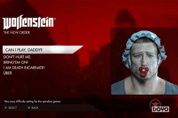 在重返狼穴的难度选择界面之下,你可以看到你自己的每一个难度下的样式,最简单的模式叫做请不要伤害我,还有一个模式叫做爸爸我能玩吗,我们甚至可以看到主人公BJ穿着婴儿服的样式附带在难度设置的右边,这个传统很早就有了,早在重返狼穴3D的时候就有简单的嘲讽表情图标在游戏中随处可见,那可是早在1992年就有了这个传统了,这个难度设置也鼓励你挑战更困难的难度,不过实在打不过的时候还是认怂的比较好,毕竟出门走着走着就被敌人秒杀的感觉更糟糕。