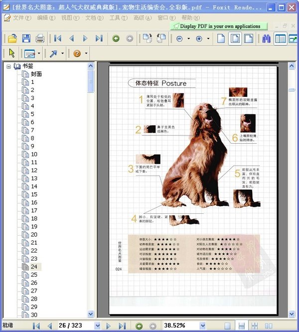 : 前言 Part 1.了解狗狗 狗狗的起源 狗狗的犬种差异与分类依据 狗狗的身体构造和机能 Part 2.运动犬 爱尔兰雪达犬 波音达犬 金毛寻回猎犬 拉布拉多猎犬 美国可卡犬 史宾格犬 魏玛犬 英国可卡犬 Part 3.工作犬 阿拉斯加雪橇犬 大丹犬 杜宾犬 西伯利亚雪橇犬 西班牙加纳利犬 美系秋田犬 巨型雪纳瑞 拳师犬 萨摩耶犬 雪纳瑞犬 Part 4.畜牧犬 澳大利亚牧羊犬 边境牧羊犬 波利犬 长须柯利牧羊犬 德国牧羊犬 佛兰德牧羊犬 高加索犬 英国古代牧羊犬 卡斯罗 马林诺斯犬 日本银狐 苏格兰牧羊犬 威尔土柯基犬 谢德兰牧羊犬 中亚牧羊犬 Part 5.狩猎犬 阿富汗猎犬 巴吉度猎犬 比格犬 惠比特犬 中国细犬 阿根廷杜高犬 Part 6.狸犬 比特犬 贝灵顿(犭更) 刚毛猎狐(犭更) 湖畔(犭更) 凯利蓝(犭更) 美洲无毛(犭更) 迷你牛头(犭更) 平毛猎狐(犭更) 爱尔兰软毛麦色(犭更) 斯凯狸(犭更) 苏格兰(犭更) 威尔土(犭更) 西高地白(犭更) 斯塔福郡斗牛(犭更) 西里汉(犭更) Part 7.家庭犬 大麦町犬 比熊犬 贵宾犬 荷兰毛狮犬 日本柴犬 松狮犬 英国斗牛犬 Part 8.玩具犬 北京犬 博美犬 八哥犬 查理王小猎犬 大灵缇 蝴蝶犬 吉娃娃犬 迷你杜宾 马尔济斯犬 墨西哥无毛犬 日本狎 西施犬 约克夏狸 中国冠毛犬 拼音索引