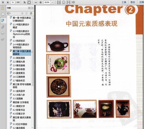: 致读者朋友的一封信. Chapter 1 中国元素设计基础知识 1.1 中国元素设计概述 1.2 中国元素设计与Photoshop的结合 1.3 色彩知识 1.4 中国元素设计常用色彩 Chapter 2 中国元素质感表现 2.1 斑驳酒壶 2.2 青铜大鼎 2.3 青花瓷碗 2.4 紫砂茶壶 2.5 晶莹美玉 2.6 江南刺绣 2.7 蜡染布艺 Chapter 3 符号与图腾表现 3.1 金凤呈祥 3.2 太极八卦 3.3 龙图腾 Chapter 4 文字表现 4.1 青铜文字 4.2 软笔书法 4.3 印章文字 Chapter 5 喜庆元素表现 5.1 红红中国结 5.2 喜庆剪纸 5.3 大红灯笼 5.4 金玉满堂 5.5 皮影传韵 5.6 吉庆年画 5.7 Q版脸谱 Chapter 6 典雅元素表现 Chapter 7 中国元素设计在商业中的应用