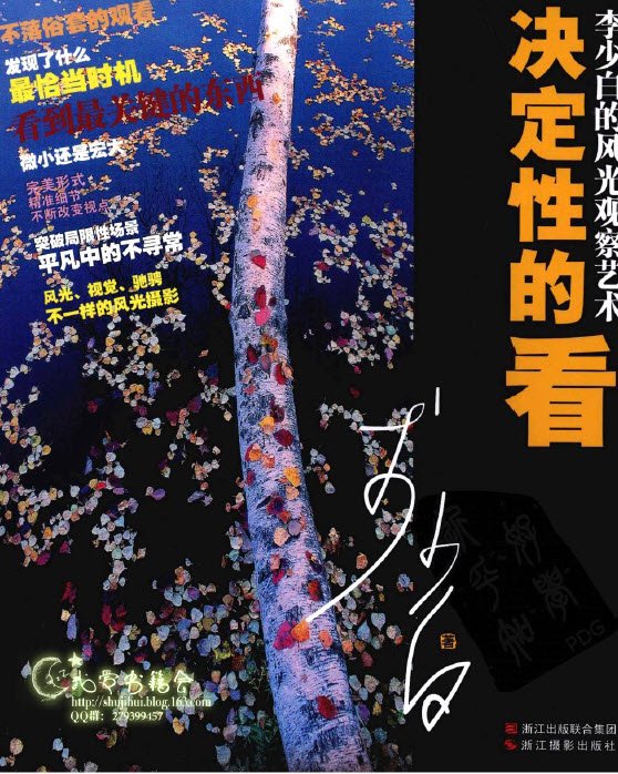《决定性的看:李少白的风光观察艺术》不光需要训练具有预见性的敏锐观察能力,同时还需要培养一种对观看的顽强追求:在凡俗美景之外寻求不落俗套的观看;在众人都认为无啥可拍的时刻寻找真正的好照片;在坏天气、坏环境中,努力寻求局限性场景的突破思路;遇到拍摄瓶颈时不停改变视点来获得不断变化的视觉构成,进而激发灵感。所有这一切,首先需要摄影家拥有一颗永不服输的心,永远不甘心拍摄一幅可能落入俗套的照片。