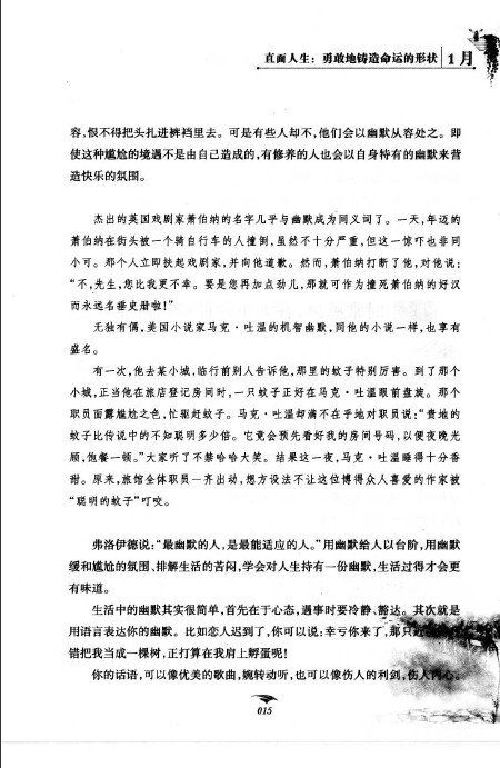 : 1月 直面人生:勇敢地铸造命运的形状 命运藏在思想里,躲在努力中 人生太“理想”,往往失去它的真实 人生总有得失,我们更应学会珍惜 绚丽的爱情之花,给人生幸福画上句号 人生难免平淡,快乐生活需要营造 时常感恩,在人生的低潮积蓄能量 要知道,父母不会在原地等我们 2月 善待自己:让快乐在内心没有边沿 凡事看开一点,画一条幸福的底线 快乐是心的选择,不要总盯着消极面 痛苦是一碗茶,快乐是一壶水 乐观面对生活,快乐并不难以获得 释放你的心,快乐不需要理由 对生活充满热情,让精神归属快乐 命运给予你哭的境遇,也给了你笑的权力 3月 掌控航向:即使偏离目标也不就此沮丧 上帝的延迟,并不等于上帝的拒绝 方向比距离更重要,一味努力不如正确努力 摔倒了几次,就要爬起来几次 有思路有出路,偏离靶心并不等于失败 胖子和瘦子,哪个走枕木走得更远 知道如何实现目标,更要知道实现后该做什么 生有缺陷,让雄心壮志为成功护航 4月 把握心境:专心于路不专心于脚下的困难 不要放弃寻找,希望永远存在 在每一次逆境中,都隐藏着成功的契机 走泥泞的路,才能留下清晰的脚印 接受所谓的不幸,期盼生活的彩虹 坚强的信念,是生命最强的支柱 不被模糊的远方羁绊,做好每天最重要的事 学会思考,向卓越者迈进 5月 锻造自我:积极铸造心灵的韧度 人生需要选择,更要懂得放弃 让心先到达,一切皆有可能 心若在,梦想就永远存在 我只看我所有的,不看我没有的 完美不能苛求,但可以无限接近 给生活一个支点,让自己亮在暗处 看清自己的价值,给予心进取的方向 6月 激扬斗志:用心感谢折磨你的人 把握自己,掌握生活中的平衡术 学会忍耐,感谢折磨你的人 掌控自己,就要事事竭尽全力 把握前进的方向,胜于丈量成功的距离 认清自己,根据兴趣发展优势 做事不拖延,学会马上行动 把握面字问题,活出自己的个性 7月 拓展张力:永远只做最好的自己 在心中填满自信,做最出色的自己 活着不是感受苦难,而是脱离苦难拥有希望 永远不满足于现状,努力做最好的自己 即使是一个螺丝钉,也要变得不可替代 不逃避艰辛,从A奔向A+ 燃烧激情,为未来主动行事 更具张力的人生。能看到更远处的风景 8月 引导成功:让怯懦的因子无处藏身 释放自己,人生不加框 只要努力,你一定能做得更好 专注细节,让自己精益求精 主宰生活,微笑是积极的人生态度 做最好的自己,铁可以比金子贵 破裂的水桶,可以浇灌出一路鲜花 换一种态度做事,思路决定出路 9月 超越自我:在承认差异时提升自己 只有第一,没有第二 学会取长补短,不要让差距加大 发现自我,找到发动引擎的钥匙 让学习成为一种习惯,让成长永无止境 让知识成为垫脚石,让眼界与未来同行 不继续成长,被淘汰就在眼前 受雇不会终生,学习永无终止 10月 回归自我:用思想敲开幸福的大门 换一种想法,窗外将是另一番风景 善于发现,勤于思考 失败总有借口,成功更有方法 要努力发现优势,更要做最擅长的事 换位思考,多替别人想一想 拓展自己,摆脱思维定式的束缚 发展创新思维,发现不一样的自己 11月 感恩工作:工作是生命获得意义的一种过程 为自己工作,为明天积累 工作就是你的事业,用心做好每一件事 能干不如肯干,把平凡变成卓越 快乐工作,享受拼搏的过程 给自己减压,不要让自己心力交瘁 点燃激情,释放自己的能量 节省自己的时间,提高工作的效率 12月 品味生活:学会享受,更要懂得珍惜 给生活一个笑脸,给自己一个安慰 懂得珍惜,提升生活的幸福指数 提升自己的经济能力,才能更好地享受生活 学会享受,生存并不是为了赚钱 善待自己的身体,有健康才有将来 不做压力的奴隶,让生活更积极 为了美好的明天,会工作更要会生活